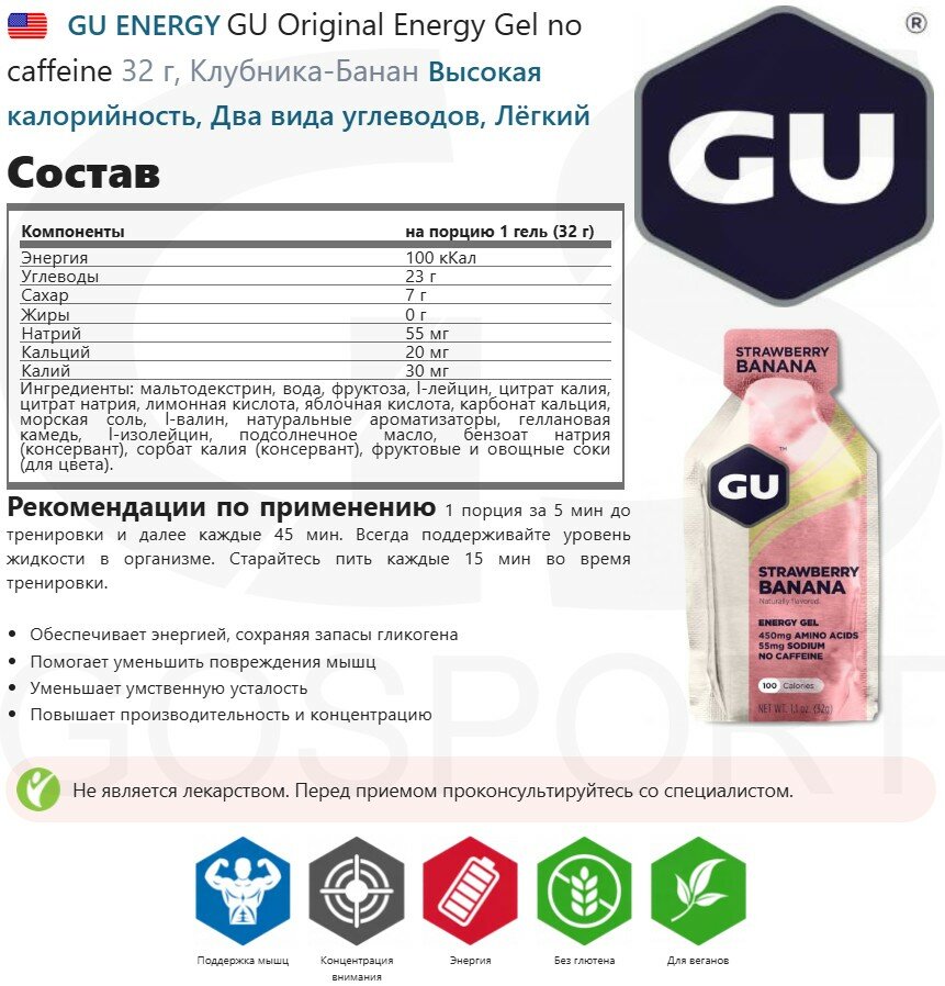 GU ENERGY GU Original Energy Gel no caffeine 4 x 32 г, Клубника-Банан: сравнение цен, характеристики, фото, актуальное наличие и цены.