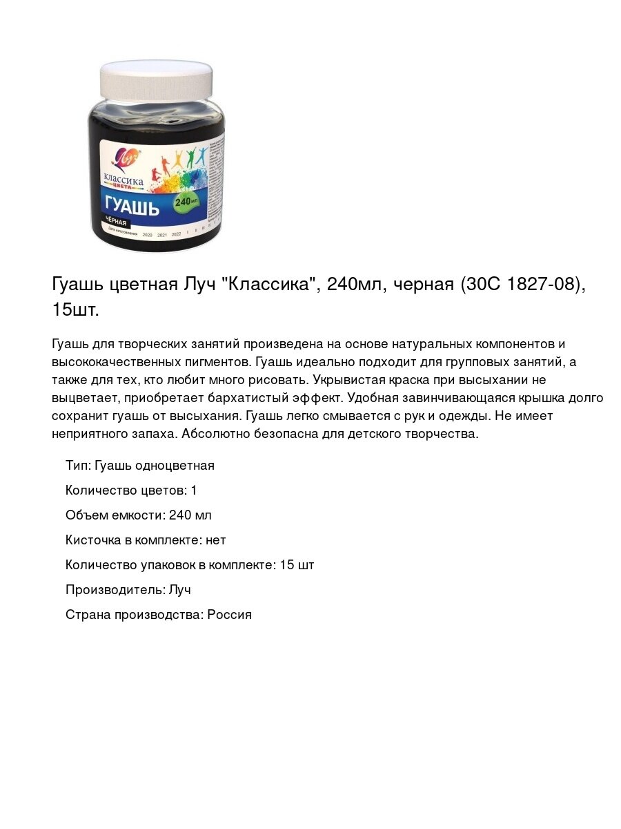 Гуашь легко смывается с рук и одежды, что обеспечивает удобство использования и легкость ухода за продуктом. В комплекте 15 штук.