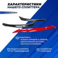 Губа на бампер Лада Веста красная вставка, комплект сплиттер "Барс", установочный комплект болты и саморезы "Барс"- на передний бампер придаст вашему автомобилю спортивные черты, так же сделает внешний облик авто выраженным и завершённым. Помимо декоративных функций, сплиттер имеет ряд функциональных преимуществ. Сплиттер позволит уменьшить дорожный просвет, что положительно скажется на прижимной силе передней части за счёт отступа от бампера. Так же сплиттер играет роль усилителя переднего бампера. Данный сплиттер состоит из трёх частей: центральной и двух боковых.