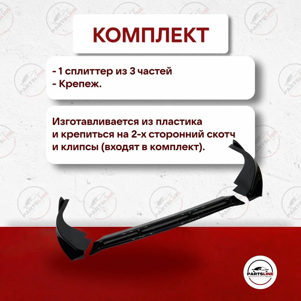 Придает современный и внушительный внешний вид переднему бамперу. Крепится с нижней стороны бампер на саморезы (надежнее) или двухсторонний скотч Сплиттер состоит из 3-х деталей - клыки (правый и левый) и сама центральная вставка.
