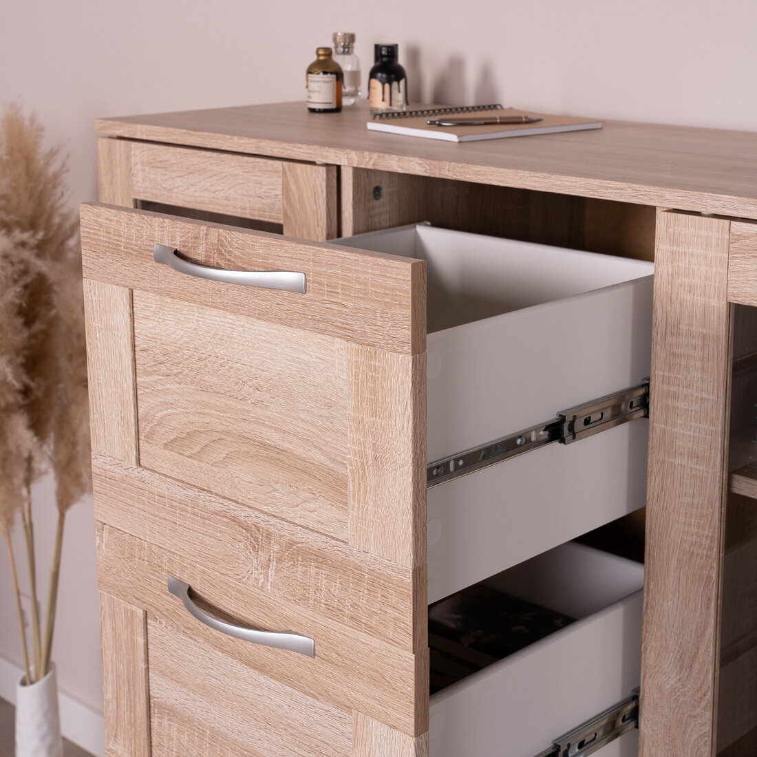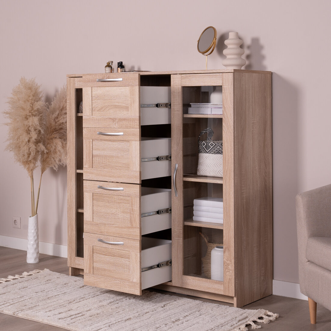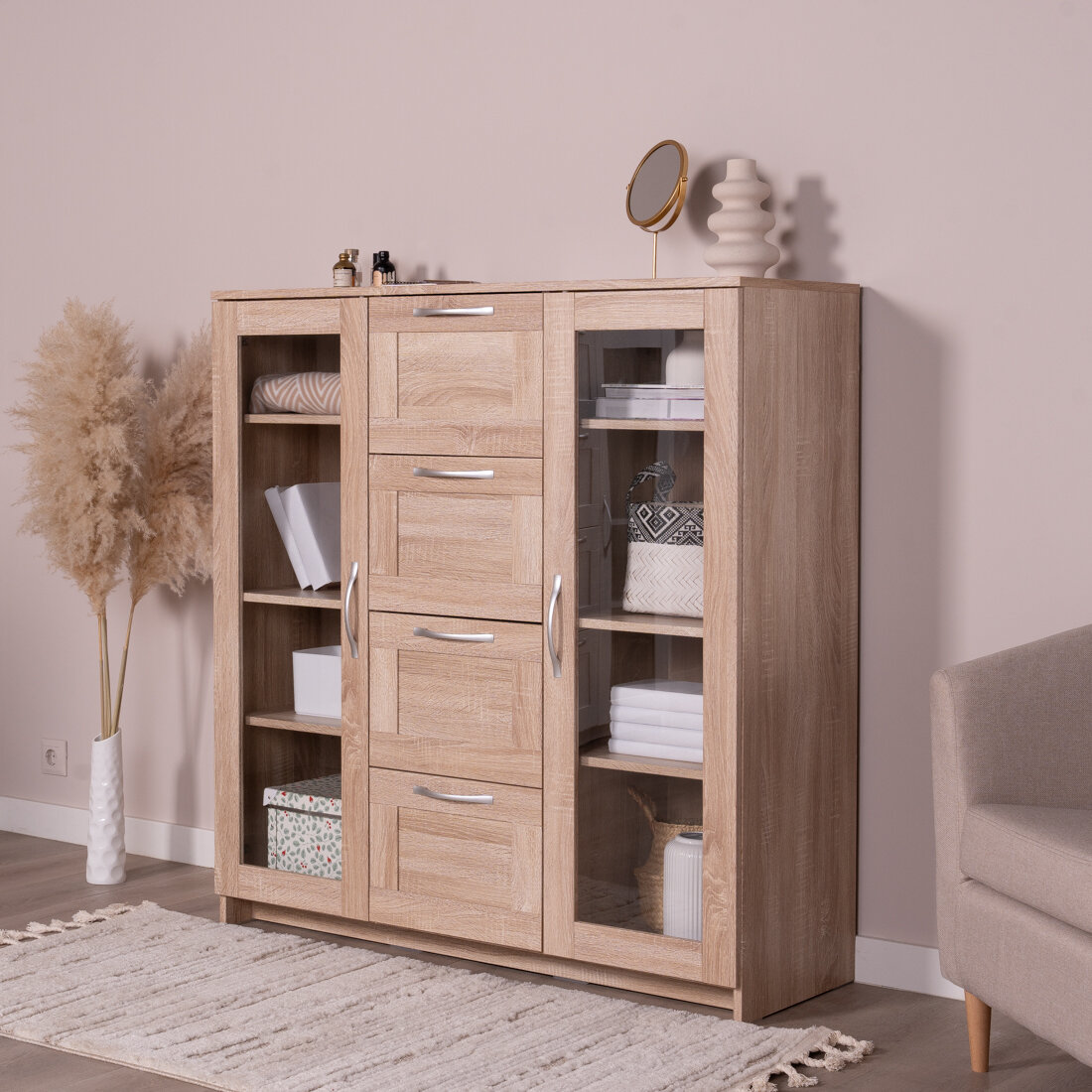Тумба ГУД лакк Сириус, 2 двери со стеклом и 4 ящика, 117х41х123 см, дуб сонома