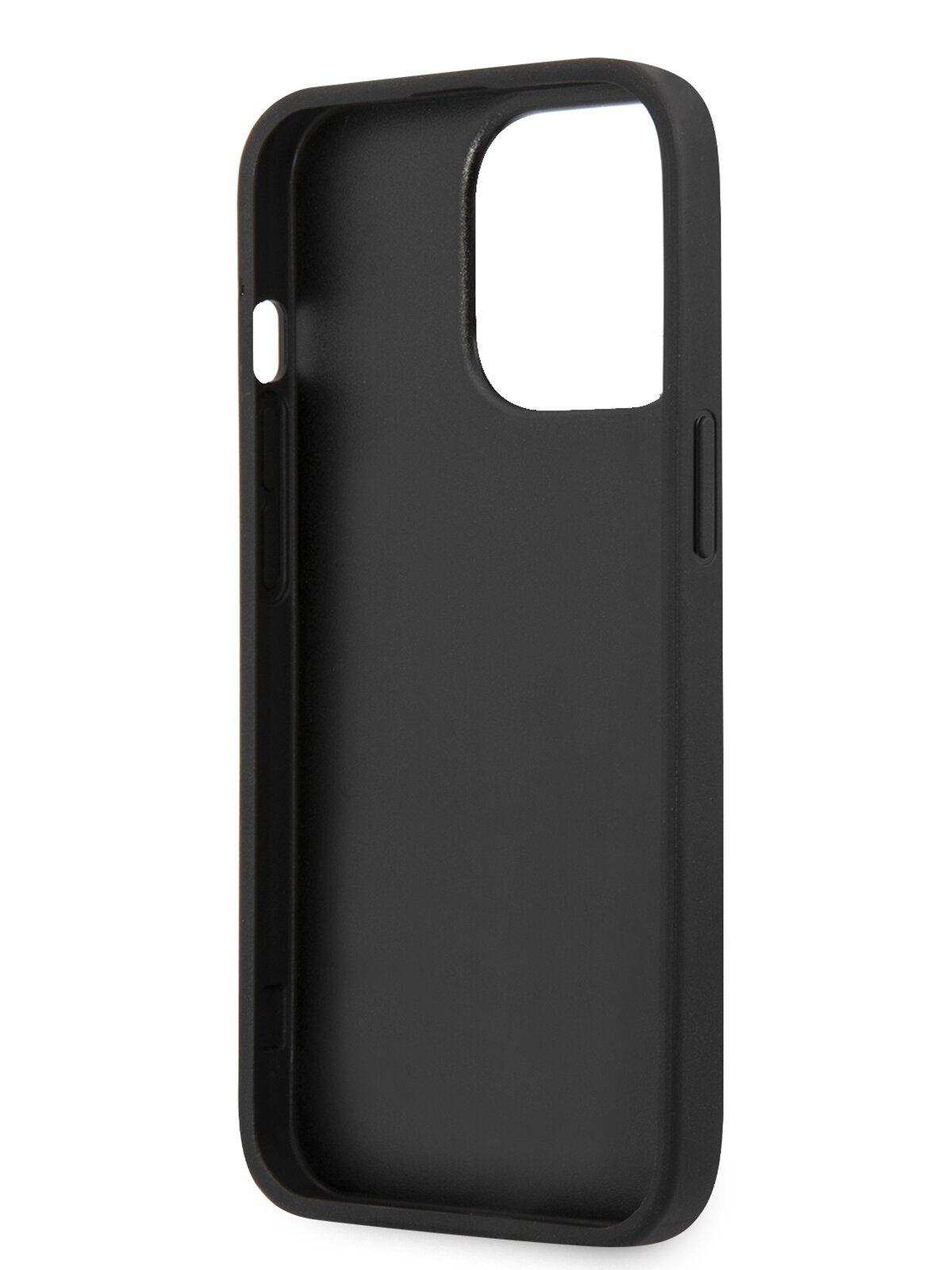 Чехол-накладка изготовлен из искусственной кожи с монограммой бренда, нанесенной на пластиковую основу. Эти материалы отлично защищают гаджет от повреждений, неизбежных в процессе ежедневной эксплуатации, а силиконовый бампер обеспечивает комортное извлечение девайса. Специальное защитное кольцо оберегает объектив от механических дефектов. Отверстия идеально совпадают с разъемами, а боковые клавиши оснащены заглушками, интегрированными в чехол - это защищает их от попадания грязи, пыли и воды. Кейс так же не препятствует беспроводной зарядке и сигналам NFC. Внешняя сторона декорирована металлическим логотипом бренда.