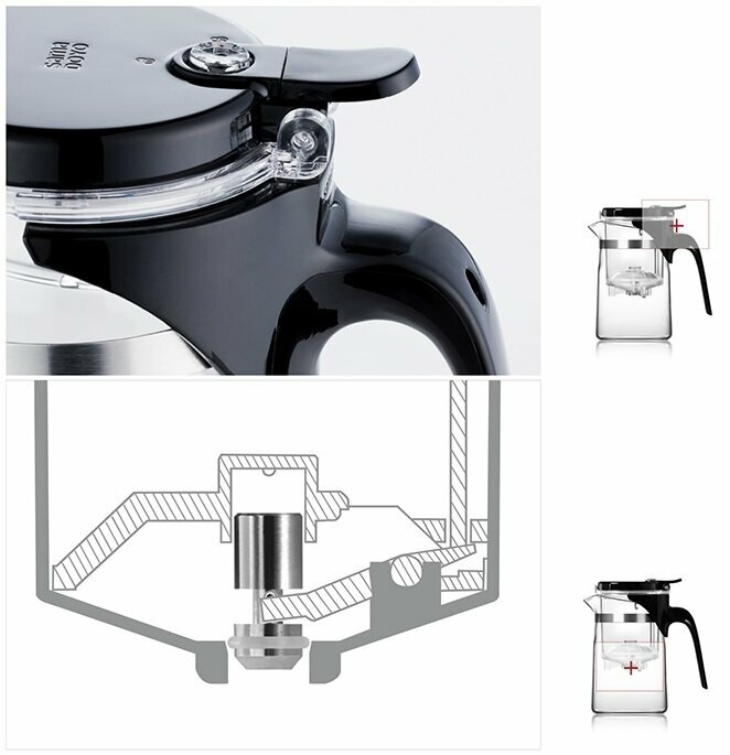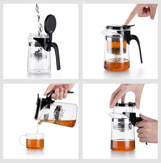Внутри чайника находится заварочная колба с ситечком. В колбу насыпается сухая заварка и заливается вода нужной температуры. Когда чай заварился, нужно нажать кнопку на крышке чайника, - заваренный чай сольется в нижнюю колбу, а заварка останется в фильтре верхней колбы, больше не контактирует с водой и готова к повторным проливам. Таким образом можно заваривать чай 5-7-10 раз в зависимости от количества листа. Всего три действия (засыпать, налить, нажать) и ваш напиток готов к употреблению. Настой всегда будет чистый, ведь заварка остается сверху в колбе, и никогда не попадет к Вам в чашку.