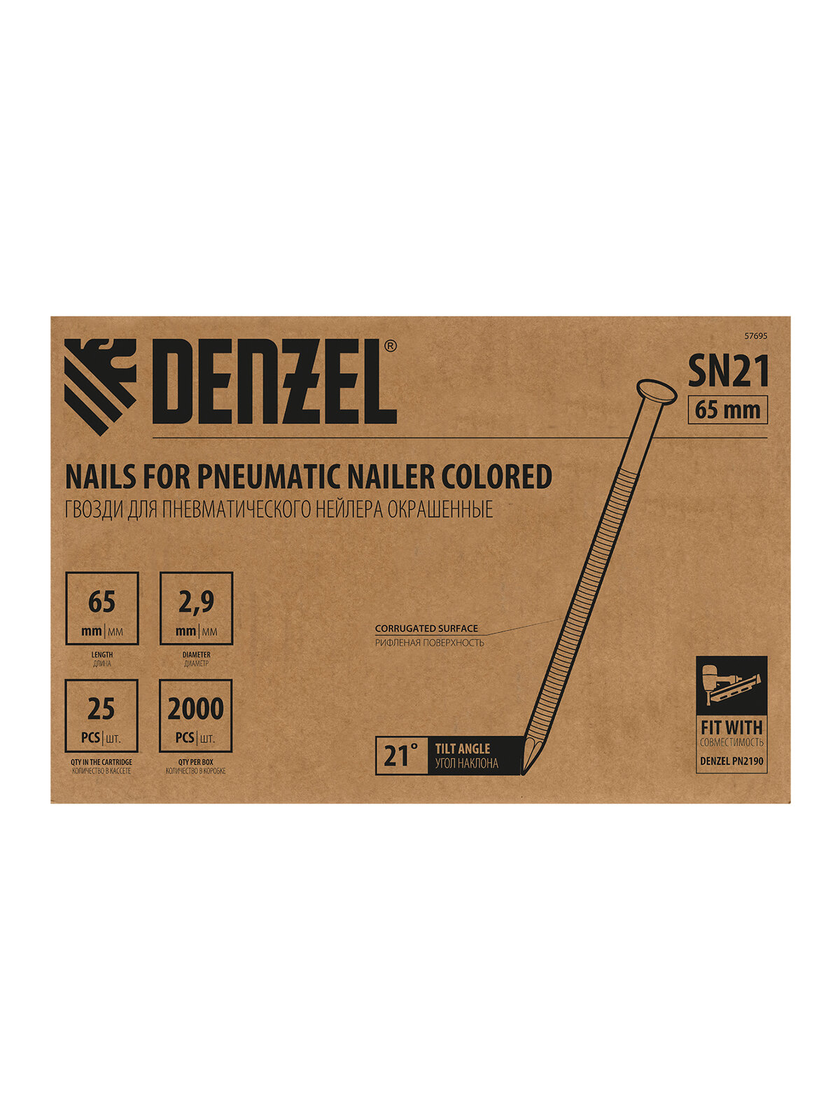 Гвозди для пневматического нейлера Denzel (крашен.), длина — 65 мм, диам. — 2,9 мм, 2000 шт. 57695: сравнение цен, характеристики, фото, актуальное наличие и цены.
