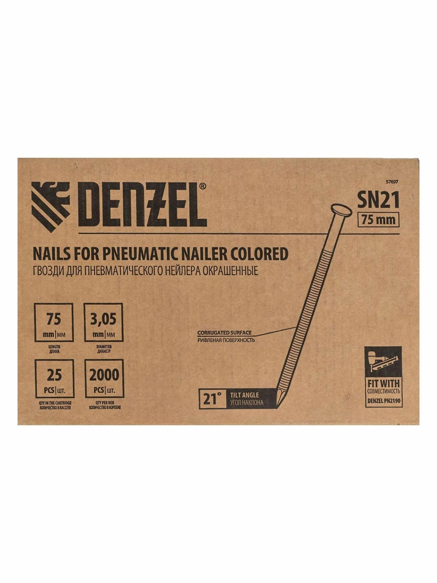 Гвозди Denzel 57697 типа SN21, длиной 75 мм и диаметром 3,05 мм, с крашеной поверхностью, 2000 шт. в упаковке, — расходники для пневматического нейлера. Используются для скрепления различных материалов, будут полезны во время сборочных и отделочных работ. ПреимуществаПрочность — крепежные элементы изготовлены из стали. Надежное и долговечное соединение — гвозди не гнутся, рифленая рабочая часть исключает их самопроизвольный выход из своих гнезд. Удобная комплектация — запаса из 2000 шт. хватит для выполнения большого объема работ.