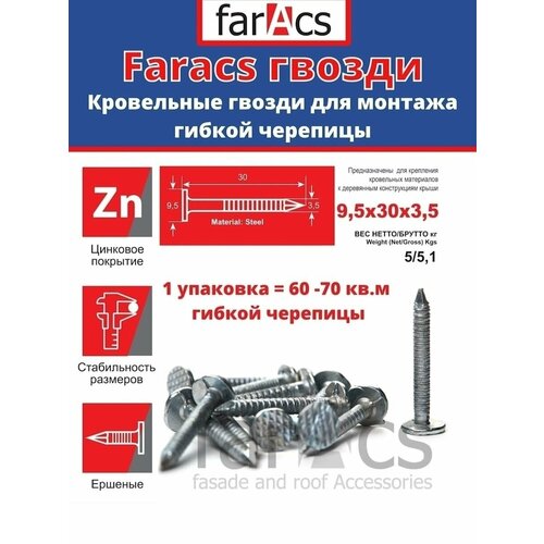 Гвозди farAcs - правильные кровельные гвозди для монтажа гибкой черепицы. Широкая шляпка 9,5 мм обеспечивает надежную фиксацию без повреждения кровельного материала, слой цинка защищает от коррозии. При укладке гибкой черепицы на сплошное основание из ОСП или фанеры необходимо использовать только ершеные гвозди, гладкие гвозди со временем "вылезают" из такого основания, приподнимая, а в некоторых случаях повреждая гонты гибкой черепицы. Гвозди без ершения используются для монтажа на основание из доски. Гвозди длиной 30 мм применяются для монтажа однослойной гибкой черепицы. Для укладки ламинированной черепицы рекомендуем использовать гвозди длиной 40 мм.**особенности** 3,5х30 мм ершеные поставляются в упаковках по 5 кг, одной упаковки хватит на монтаж 60-70 кв. м. гибкой черепицы.