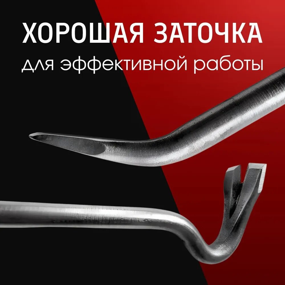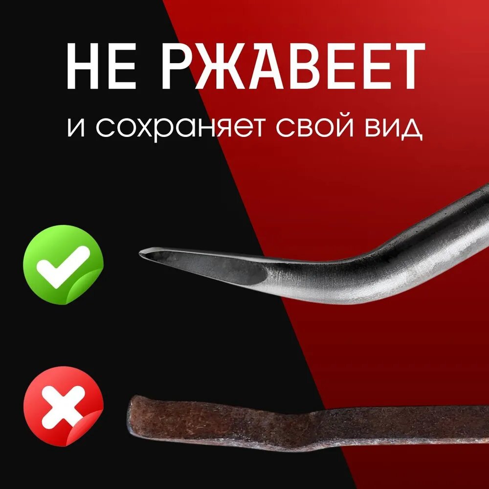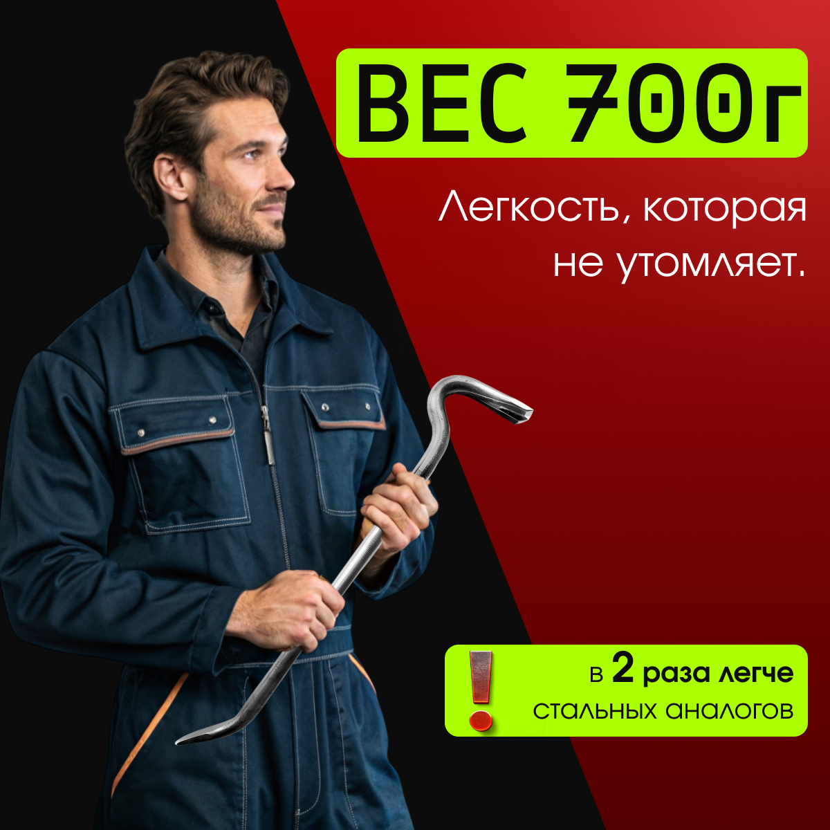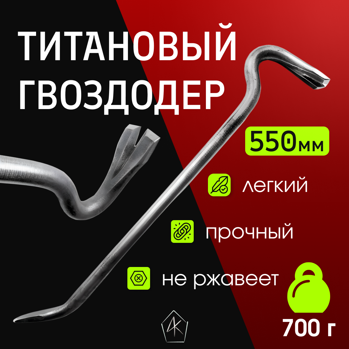 Гвоздодер изготовлен из жесткого жаропрочного титанового сплава, который в 1,7 раза легче стали. При этом он не ржавеет, удобно лежит в руке, выдерживает большие нагрузки.