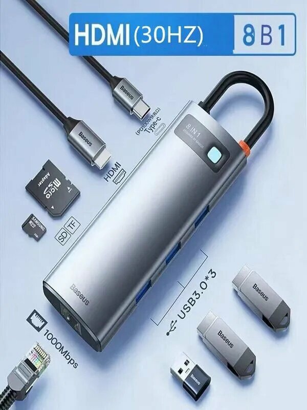Хаб USB-концентратор Baseus 4K@30Hz 8-in-1 STARJOY 8-PORT TYPE-C HUB ADAPTER Gray (WKWG080013): сравнение цен, характеристики, фото, актуальное наличие и цены.