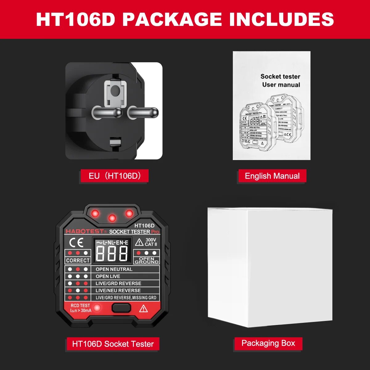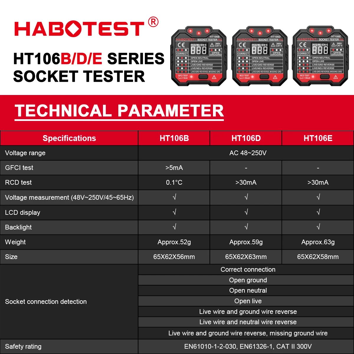 HABOTEST HT106 цифровая розетка Tester Pro, умный детектор напряжения RCD, вилка EU US UK, нулевая линия полярности, проверка фазы, EU Plug: сравнение цен, характеристики, фото, актуальное наличие и цены.
