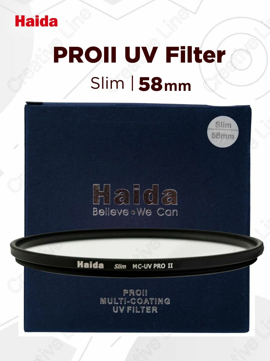 Haida PROII Multi-Coating UV Slim Filter 58mm — защитный ультрафиолетовый светофильтр. Изготовлен из высококачественного оптического стекла K9 с антибликовым покрытием. С обеих сторон имеет несколько слоев нанопокрытия, что предотвращает попадание пыли и влаги на элементы объектива, исключает случайные повреждения.