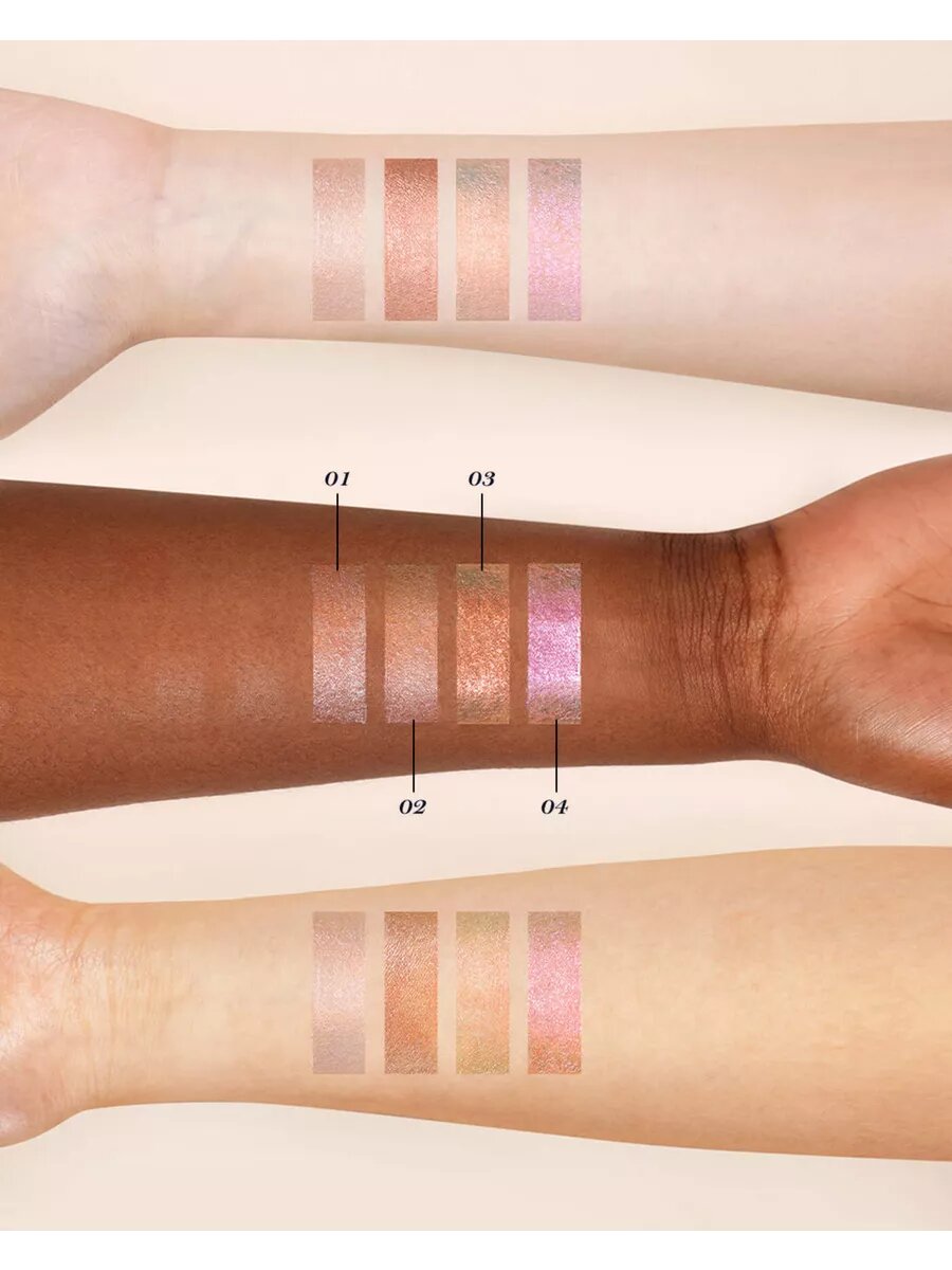 Ощутите неземное сияние нашего жидкого хайлайтера Midsummer Night. Насыщенный ультраотражающими микроблесками, этот хайлайтер мгновенно осветляет брови, нос, скулы и многое другое. С помощью этой сияющей формулы подчеркните овал лица и придайте ему сияющий вид.