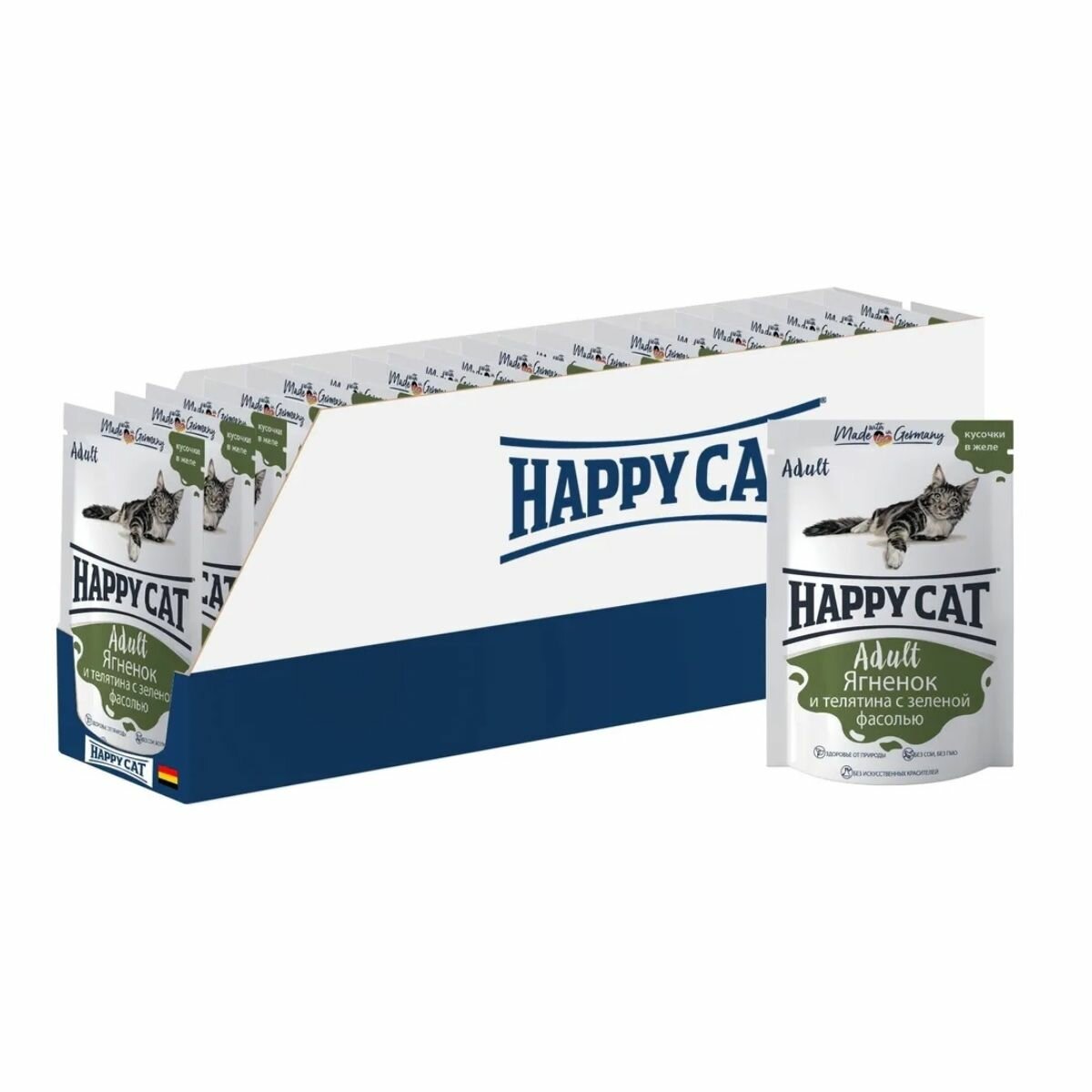 Happy Cat Паучи для взрослых кошек, с ягненком, телятиной и зеленой фасолью, в желе 24шт*85 гр: сравнение цен, характеристики, фото, актуальное наличие и цены.
