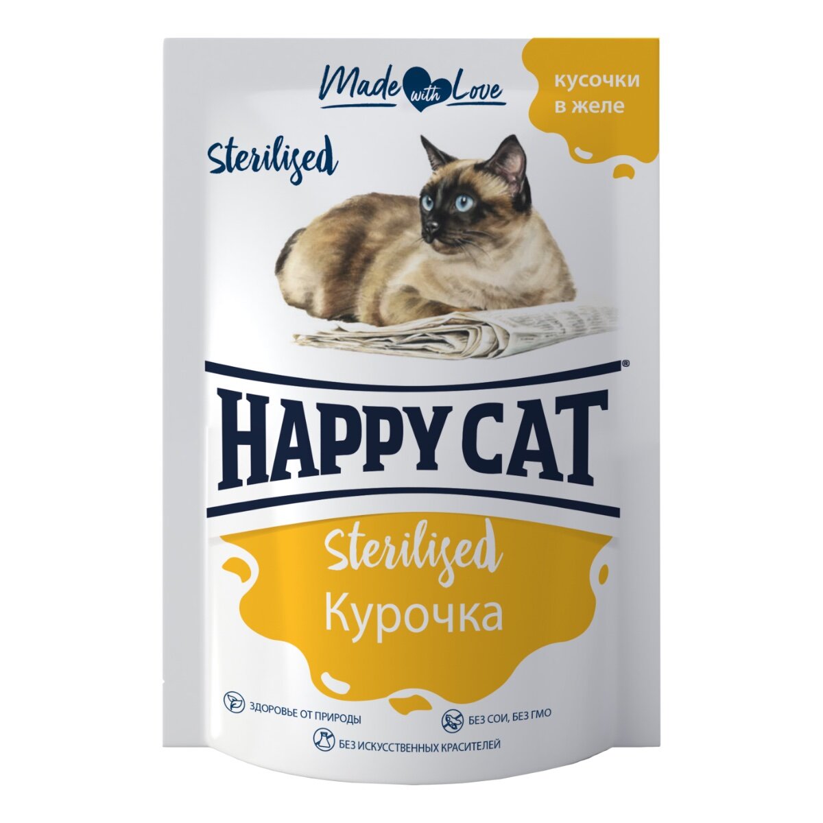 Happy Cat Влажный корм для стерилизованных кошек, курочка, кусочки в желе — 24 шт* 85 гр: сравнение цен, характеристики, фото, актуальное наличие и цены.