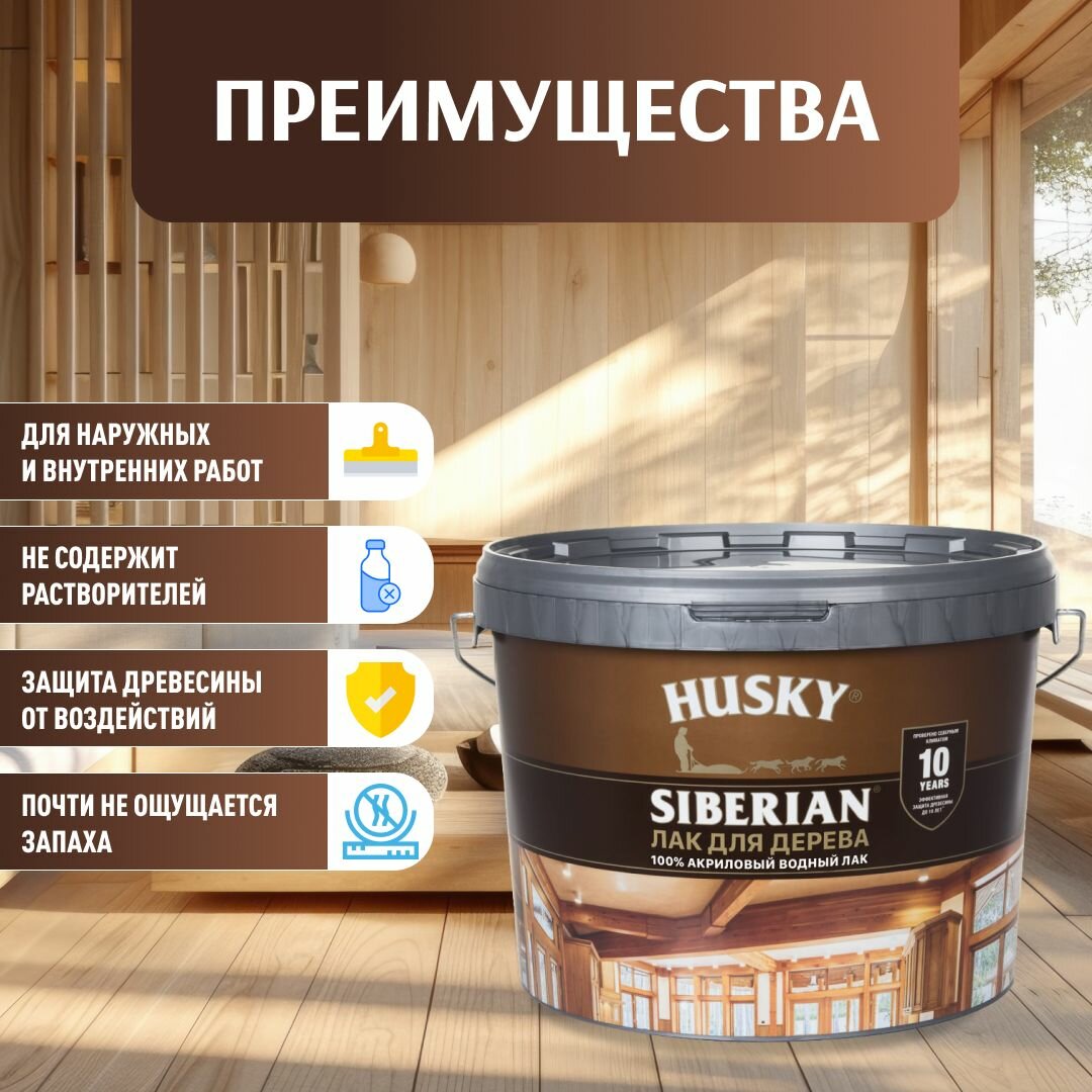 Акриловый лак для дерева HUSKY Siberian «Аква-лак». Полуматовый акриловый лак для долговечной защиты (до 10 лет) ранее неокрашенных деревянных потолков, стен, деревянной мебели. Быстро сохнет, не содержит растворителей и практически не пахнет.