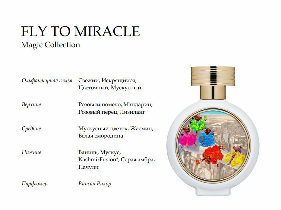 Взрослые нуждаются в сказке даже больше чем дети! И если вам кажется, что волшебства больше не существует, просто вы слишком заняты чтобы его увидеть. Остановитесь на мгновение, чтобы вспомнить свое детство, и позвольте себе быть немного ребенком. И тогда вы увидите новую реальность, которая унесет вас в сказочный мир чудес и волшебства. И что же тогда делать? – просто наслаждаться моментом, поверить в сказку и лететь навстречу чуду. HFC Fly To Miracle — захватывающий и волшебный аромат, который позволит вам погрузиться в мир чудес. Сочетание свежих и ярких верхних нот мандарина, розового перца, помело и лизиланга создает энергичное и яркое открывающее звучание. Сердце аромата Fly To Miracle раскрывается нежным и привлекательным сочетанием мускуса, жасмина и белой смородины. Мускус добавляет аромату чувственность и мягкость, жасмин придает ему цветочную и изысканную ноту, а белая смородина создает свежесть и яркость. Базовые ноты HFC Fly To Miracle включают мускус, пачули, ваниль, серую амбру и кашемировое дерево. Мускус в базе усиливает чувственность аромата, пачули добавляет глубину и загадочность. Ваниль придает аромату сладость и теплоту, а серая амбра создает интригующую и долговечную базу. Кашемировое дерево добавляет аромату утонченность и элегантность. Верхние ноты: Розовый помело, Мандарин, Розовый перец, ЛизилангСредние ноты: Мускусный цветок, Жасмин, Белая смородинаБазовые ноты: Мускус, Пачули, Ваниль, Серая амбра и Кашемировое дерево. Парфюмер: Винсан Рикор