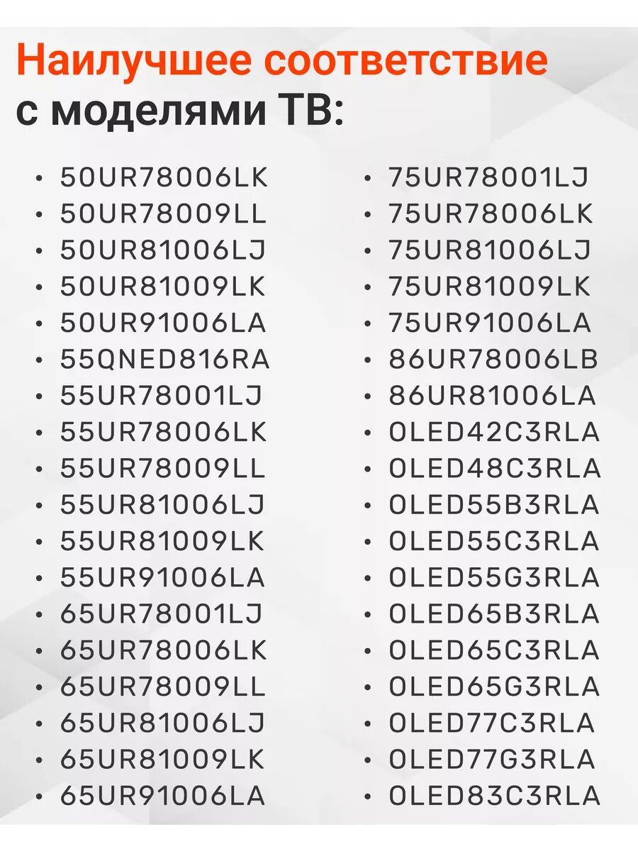 | Совместимые модели | AIWA 20LE7011, AIWA 40LE7120S, AKAI LEA-19E17P, AKAI LEA-22E17P, AKAI LEA-24A64M, AKAI LEA-24A65W, AKAI LTA-32E18P, BBK 24LEX-7389/TS2C, BBK 24LEX-7390/TS2C, BBK 32LEX-7387/TS2C, BBK 32LEX-7388/TS2C, BBK 32LEX-7389/TS2C, BBK 39LEX-7389/TS2C, BBK 43LEX-7387/FTS2C, BBK 43LEX-7389/FTS2C, BBK 43LEX-8361/UTS2C, BBK 43LEX-8387/UTS2C, BBK 43LEX-8389/UTS2C, BBK 55LEX-8327/UTS2C, BBK 55LEX-8361/UTS2C, BBK LT2610S, BBK LT2710S, BBK LT3210S, DEXP F32D7000C, DEXP F40B7000H, DEXP F40B7100K, DEXP F40C8000H, DEXP F43C7100K, DEXP F43E8000H, DEXP H28D7300K, DEXP H32E8000H, DEXP H32G8100Q, DEXP U43D9100H, DEXP U43G8200Q, DEXP U50E9000H, DEXP U55D9000H, DEXP U55E9000H, DEXP U65D9000H, DEXP U65E9000H, DEXP U75E9000H, Erisson 19LJ08, Erisson 20HLE19T2, Erisson 20HLE20T2, Erisson 22FLE19T2, Erisson 22FLE20T2, Erisson 22FLES85T2, Erisson 22LDJ08, Erisson 22LES76T2, Erisson 22LES78T2W, Erisson 24HLE18T2W, Erisson 24HLE20T2, Erisson 24LEA20T2SM, Erisson 24LEA78T2SM, Erisson 24LES16, Erisson 24LES76T2, Erisson 24LES78T2, Erisson 24LES85T2, Erisson 24LES95T2S, Erisson 28LEA20T2SM, Erisson 28LES50T2, Erisson 28LES80T2, Erisson 32FLEA97T2SMS, Erisson 32FLEA98T2, Erisson 32FLEA99T2SM, Erisson 32HLE19T2, Erisson 32LEA17T2G, Erisson 32LEA17T2S, Erisson 32LEA18T2SM, Erisson 32LEA19T2SM, Erisson 32LEA20T2SM, Erisson 32LEA28T2, Erisson 32LES16, Erisson 32LES60T2, Erisson 32LES75T2, Erisson 32LES76T2, Erisson 32LES77T2G, Erisson 32LES77T2S, Erisson 32LES78T2W, Erisson 32LES80T2, Erisson 32LES81T2, Erisson 32LES85T2, Erisson 32LX9100T2, Erisson 39LES50T2, Erisson 39LES60T2, Erisson 39LES65, Erisson 40FLE20T2, Erisson 40FLEA99T2SM, Erisson 40FLES81T2, Erisson 40FLES85T2, Erisson 40LES85T2, Erisson 42LEA17T2G, Erisson 43FLES80T2, Erisson 43FLES81T2, Erisson 43LES85T2, Erisson 50FLEA99T2SM, Erisson 50ULES85T2SM, Erisson 55ULES90T2SM, Fusion FLTV-22T9, Fusion FLTV-32F18, Fusion FLTV-32H18, GALATEC LE2216, GALATEC LE2416, GALATEC LE2816, GoldStar LT-19A310R, GoldStar LT-19T300R, GoldStar LT-19T305R, GoldStar LT-22T300F, GoldStar LT-22T305F, GoldStar LT-24T305F, HAMBER 22HRP6008, HAMBER 22HRP6018, HAMBER 32HRP5008, HARTENS HTY-43FHD06W-S2, HARTENS HTY-55UHD11B-S2, HIPER H24YQ2200GR, HIPER H32YQ2200GR, HIPER U55YQ2200GR, HIPER U65YQ2200GR, HYUNDAI H-LED32FS5004, HYUNDAI H-LED32FS5006, HYUNDAI H-LED43FS5004, HYUNDAI H-LED43FU7004, HYUNDAI H-LED50FU7002, HYUNDAI H-LED50FU7004, HYUNDAI H-LED55FU7004, HYUNDAI H-LED65FU7002, HYUNDAI H-LED75FU7002, Harper 20R470T, Helix HTV-163L, Helix HTV-223L, Helix HTV-225L, Helix HTV-243L, Helix HTV-323L, Helix HTV-324L, Helix HTV-329W, Helix HTV-407T2, Hi VHIX-43U169, Hi VHIX-50U169, Hi VHIX-55U169, Hi VHIX-65U169, Hiper U43YQ2200GR, Hiper U50YQ2200GR, Hisense 43AE7400F, Hisense 50AE7400F, Hisense 55AE7200F, Hisense 65A7500F, Hisense H32A5600, Hisense H32A5840, Hisense H32B5600, Hisense H39A5600, Hisense H40B5600, Hisense H43A5600, Hisense H43A6100, Hisense H43A7500F, Hisense H43B7100, Hisense H43B7300, Hisense H43B7500, Hisense H50A6100, Hisense H50AE7200F, Hisense H50B7100, Hisense H50B7300, Hisense H50B7500, Hisense H55A6100, Hisense H55B7100, Hisense H55B7300, Hisense H55B7500, Hisense H65A6100, Hisense H65B7300, Hisense H65B7500, Hisense LHD32D39AT, Hisense LHD32D50TS, Hisense LTDN40D50TS, Hyundai H-LCDVD3200, LG 32CS460, LG 32LA621V, LG 32LA644V, LG 32LM580S, LG 32LM620, LG 32LM640S, LG 32LM640T, LG 32LM660, LG 37LM620, LG 37LS5600, LG 37LS570S, LG 39LA620, LG 42LA620V, LG 42LA644V, LG 42LA645, LG 42LB677V, LG 42LM620S, LG 42LM620T, LG 42LM625, LG 42LM640S, LG 42LM640T, LG 42LM660S, LG 42LM660T, LG 42LM670S, LG 42LM671S, LG 42LM760, LG 42LM765S, LG 42LM860V, LG 43NANO766PA, LG 43NANO776PA, LG 43UP76906LE, LG 43UP78006LC, LG 47LA620V, LG 47LA621V, LG 47LA644V, LG 47LB670V, LG 47LM620S, LG 47LM620T, LG 47LM640T, LG 47LM660S, LG 47LM670S, LG 47LM671S, LG 47LM760S, LG 47LM765S, LG 47LM860V, LG 47LM960V, LG 50LA644V, LG 50NANO766PA, LG 50NANO826QB, LG 50UP76506LD, LG 50UP77006LB, LG 50UP77026LB, LG 50UP77506LA, LG 50UR78009LL, LG 50UR81006LJ, LG 50UR81009LK, LG 50UR91006LA, LG 55LA640, LG 55LM620S, LG 55LM620T, LG 55LM640, LG 55LM660, LG 55LM670, LG 55LM671, LG 55LM760S, LG 55LM765, LG 55LM860V, LG 55LM960, LG 55NANO766PA, LG 55NANO776PA, LG 55NANO80VPA, LG 55NANO816PA, LG 55NANO826QB, LG 55NANO866PA, LG 55NANO896PC, LG 55UB850V, LG 55UP77506LA, LG 55UR78001LJ, LG 55UR78006LK, LG 55UR78009LL, LG 55UR81006LJ, LG 55UR81009LK, LG 55UR91006LA, LG 60UP77506LA, LG 60UP80006LA, LG 65LM620S, LG 65NANO756QA, LG 65NANO766PA, LG 65NANO776QA, LG 65NANO806QA, LG 65NANO80VPA, LG 65NANO896PC, LG 65QNED916PA, LG 65UN80006LA, LG 65UP76506LD, LG 65UP77506LA, LG 65UR78001LJ, LG 65UR78006LK, LG 65UR78009LL, LG 65UR81006LJ, LG 65UR81009LK, LG 65UR91006LA, LG 6710V00008A, LG 6710V00027F, LG 6710V00070A, LG 6710V00088A, LG 6710V00090A, LG 6710V00124D, LG 6710V00124E, LG 70UP77506LA, LG 75NANO766PA, LG 75NANO806PA, LG 75UP77506LA, LG 75UP80006LA, LG 75UR78001LJ, LG 75UR78006LK, LG 75UR81006LJ, LG 75UR81009LK, LG 75UR91006LA, LG 86QNED996PB, LG 86UQ91006LA, LG 86UR78006LB, LG 86UR81006LA, LG CF-20S13KE, LG CT-21Q42KEX, LG OLED42C21LA, LG OLED42C3RLA, LG OLED48C3RLA, LG OLED55A1RLA, LG OLED55B3RLA, LG OLED55C3RLA, LG OLED55CXRLA, LG OLED55G3RLA, LG OLED65A1RLA, LG OLED65B2LA, LG OLED65B3RLA, LG OLED65C24LA, LG OLED65C3RLA, LG OLED65G3RLA, LG OLED77B26LA, LG OLED77C3RLA, LG OLED77G3RLA, LG OLED83C3RLA, Leff 32H530T, Lumus 20NP5001, Lumus 24NP5001, Lumus 28NP5001, Lumus 32NP5001, Lumus 40NP5001, Lumus 40NP6001, Lumus 49NP5001, Lumus 49NP6001, NESONS 24PR530, NESONS 28PR510T2, NESONS 32PF515S, NESONS 32PR610, NESONS 32R553T2, NESONS 40PF530, Novex NWT-24H121MS, Novex NWT-24H133SS, Novex NWX-50U169TSS, Novex NWX-55U169TSS, Novex NWX-65U169TSS, Orion OLT-24712, Orion OLT-32502, Orion OLT-32702, Polar 48LTV3103, Polar 55TV3103, Polar 81LTV3102, Polar 81LTV3103, Polar P20L31T2C, Polar P28L31T2C, Polar P32L31T2S, Polar P32L35T2C, Polar P39L31T2C, Polar P42L21T2C, Polarline 20PL12TC, Polarlin