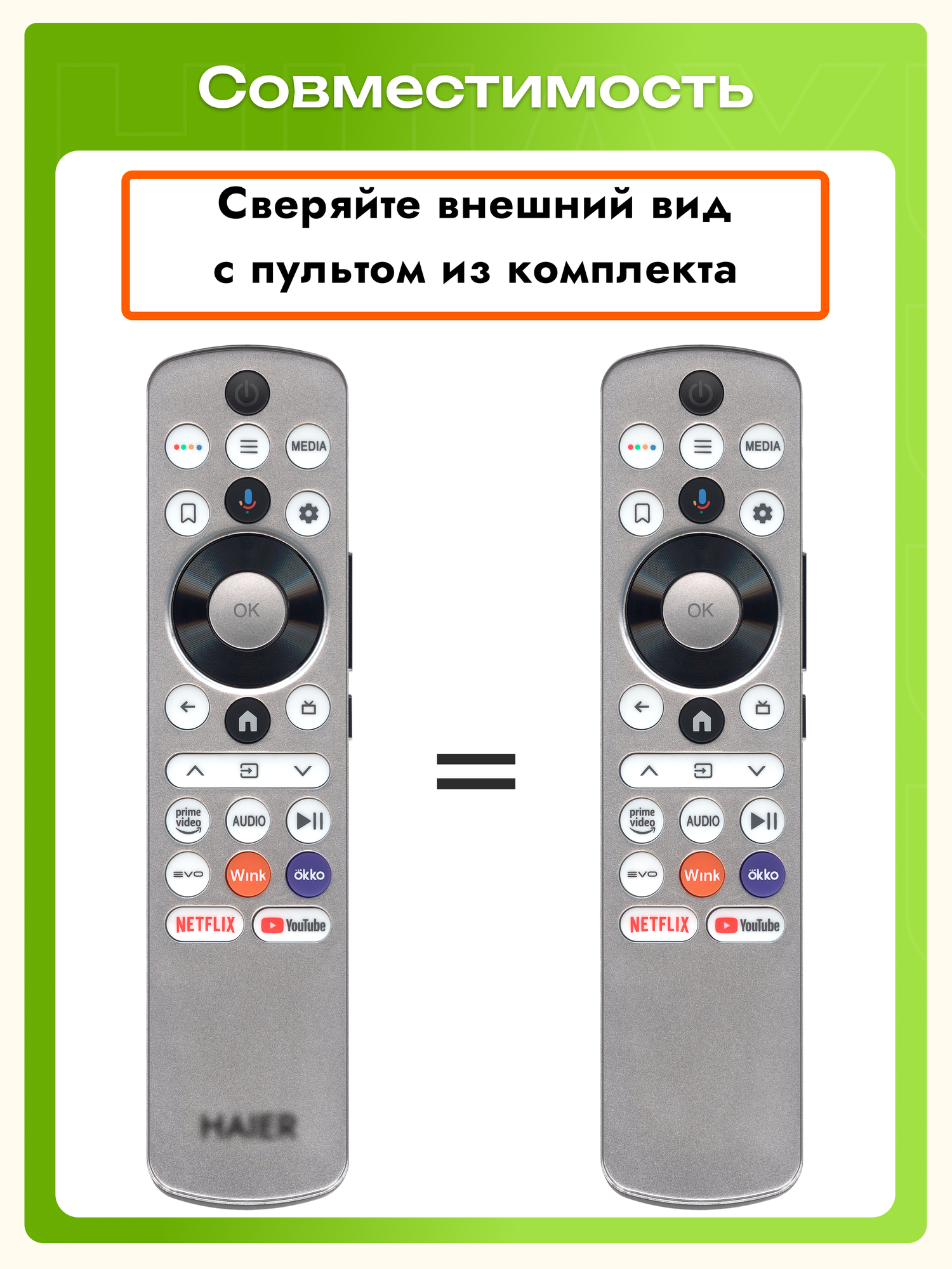 Голосовой пульт дистанционного управления HUAYU HTR-U33R для телевизоров Haier / Хейер / Хайер / Хаер с функцией WINK. Для работы голосового поиска необходимо подключить пульт ДУ по Bluetooth, инструкция представлена на дополнительном фото товара. Выбирая этот пульт, убедитесь, что модель Вашего ТВ указана в списке поддерживаемого оборудования и/или внешний вид товара соответствует пульту из комплекта. HTR-U33R отвечает высоким мировым стандартам качества и безопасности, что подтверждается соответствующей сертификацией товаров HUAYU и станет прекрасной заменой сломанного или утерянного пульта.