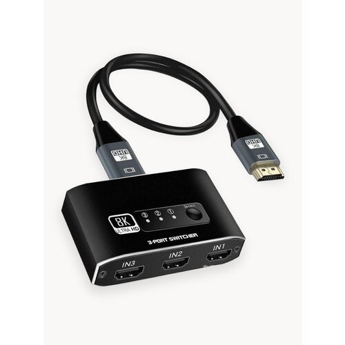 HDMI 2.1 8k 4k 120hz switcher 3*1, переключатель прост в использовании, и может широко использоваться в учебе, развлечениях, работе и других случаях. HDMI Switch 3 совместим со всеми устройствами HDMI 2.1. Вход: PS5, PS4, Roku, Fire TV, Blu-Ray, DVD, Xbox 360, Xbox One, Beamer, ноутбук, совместимый с Apple TV. Выход: HD TV, проекторы, мониторы. Коммутатор HDMI 2.1 поддерживает 8K при 60 Гц, 4K при 120 Гц, 1080P при 240 Гц, обеспечивает скорость передачи до 48 Гбит/с и обратно; совместим со всеми предыдущими стандартами HDMI. Высокоскоростная и стабильная передача видеосигнала высокой четкости с плавным и неискаженным качеством изображения. Подключи и работай: дополнительное питание не требуется, коммутатор 8K HDMI автоматически получает питание от устройств-источников через порты HDMI. Этот переключатель HDMI имеет функцию переключения нажатием клавиши, вы можете нажать кнопку, чтобы изменить источник входного сигнала, который вы хотите использовать. Примечание: для разрешения 8K длина кабелей HDMI, подключенных к обоим концам коммутатора, не должны превышать 3 метра!