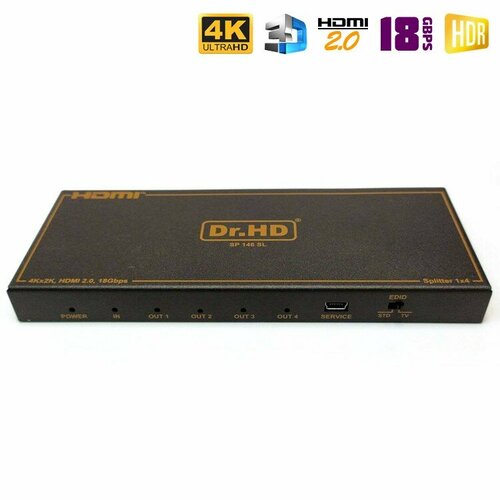 HDMI сплиттер на 4, который собрал в себе самые продвинутые характеристики на сегодняшний день: HDMI 2.0b, HDCP 2.2, полоса частот 18Gbps, 4K с частотой до 60Hz, 3D 1080p с частотой до 60Hz, HDR, YCBCR 4:4:4 и поддержка самых современных аудио форматов.