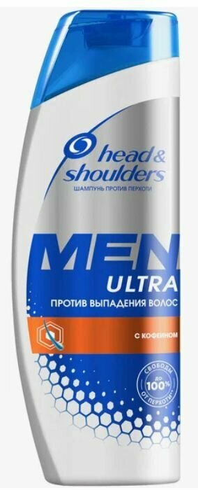 Шампунь против перхоти Head & Shoulders (Хед энд Шолдерс) Men Ultra Против выпадения волос с кофеином ухаживает за волосами и кожей головы, полностью оправдывая ожидания даже самых требовательных мужчин. Это средство от перхоти очищает кожу головы и волосы, а также способствует укреплению волос, уменьшая их выпадение из-за перхоти и ломкости. Шампунь содержит активные компоненты пиритион цинка и карбонат цинка, благодаря которым он обеспечивает до 100% свободы от перхоти*. Его pH-сбалансированная формула протестирована дерматологами и не содержит парабенов, фосфатов и парафинов. Head&Shoulders — бренд шампуней № 1 в мире**, который также заботится о планете: флакон на 40% состоит из переработанного пластика (за исключением крышки и этикетки) и пригоден для переработки. *Видимой перхоти при регулярном применении. **По продажам. На основании данных NielsenIQ RMS для категории шампуней за 12 мес, завершившихся 30.04.2021, для общего рынка розничной торговли.
