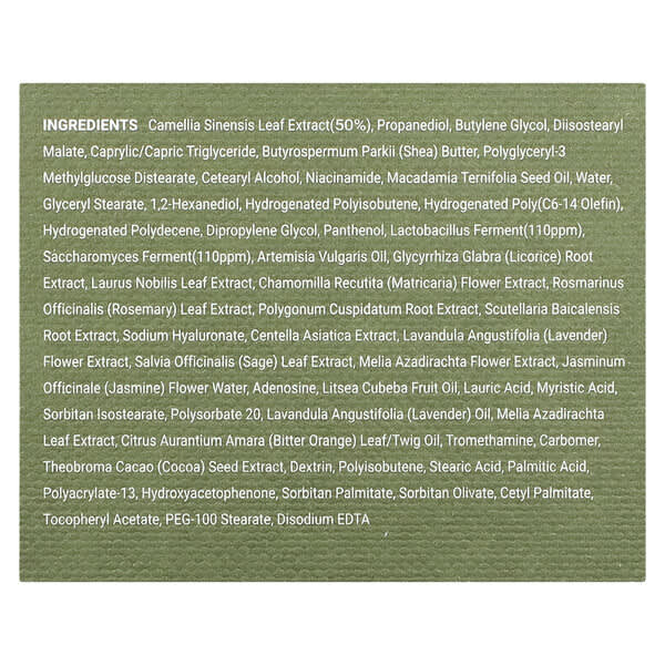 | Состав | Water, Camellia Sinensis Leaf Extract (58,760 ppm), Propanediol, Pentylene Glycol, Glycerin, Methylpropanediol, Butylene Glycol, Xylitol, Chondrus Crispus Extract, Saccharum Officinarum (Sugarcane) Extract, Artemisia Vulgaris Oil, Citrus Aurantium Amara (Bitter Orange) Leaf/Twig Oil, Melia Azadirachta Leaf Extract, Lavandula Angustifolia (Lavender) Oil, Litsea Cubeba Fruit Oil, Melia Azadirachta Flower Extract, Ocimum Sanctum Leaf Extract, Cynanchum Atratum Extract, Laurus Nobilis Leaf Extract, Saccharomyces Ferment (20ppm), Lactobacillus Ferment (20ppm), Curcuma Longa (Turmeric) Root Extract, Corallina Officinalis Extract, Althaea Rosea Flower Extract, Cryptomeria Japonica Leaf Extract, Nelumbo Nucifera Leaf Extract, 1,2-Hexanediol, Caprylyl Glycol, Polyglyceryl-10 Laurate, Panthenol, Ethylhexylglycerin, Sodium Phytate, Tocopherol, Carbomer, Xanthan Gum |