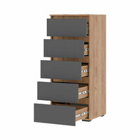Размер: (ШхВхГ) 502х1188х460 Корпус: ЛДСП - Дуб Крафт золотой Фасад: ЛДСП - Cерый графит Комод Хелен это модуль сквозной коллекции, разработанной в скандинавском стиле. Наполнение: Ящики. Ящики: Шариковые направляющие. Опоры: Пластик 20мм. Товар продается в разобранном виде.