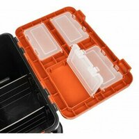 На внутренней стороне откидной крышки размещены 4 прозрачных закрывающихся бокса, в которых достаточно места для блесен, балансиров, рыболовных крючков, мормышек и прочих мелких снастей.