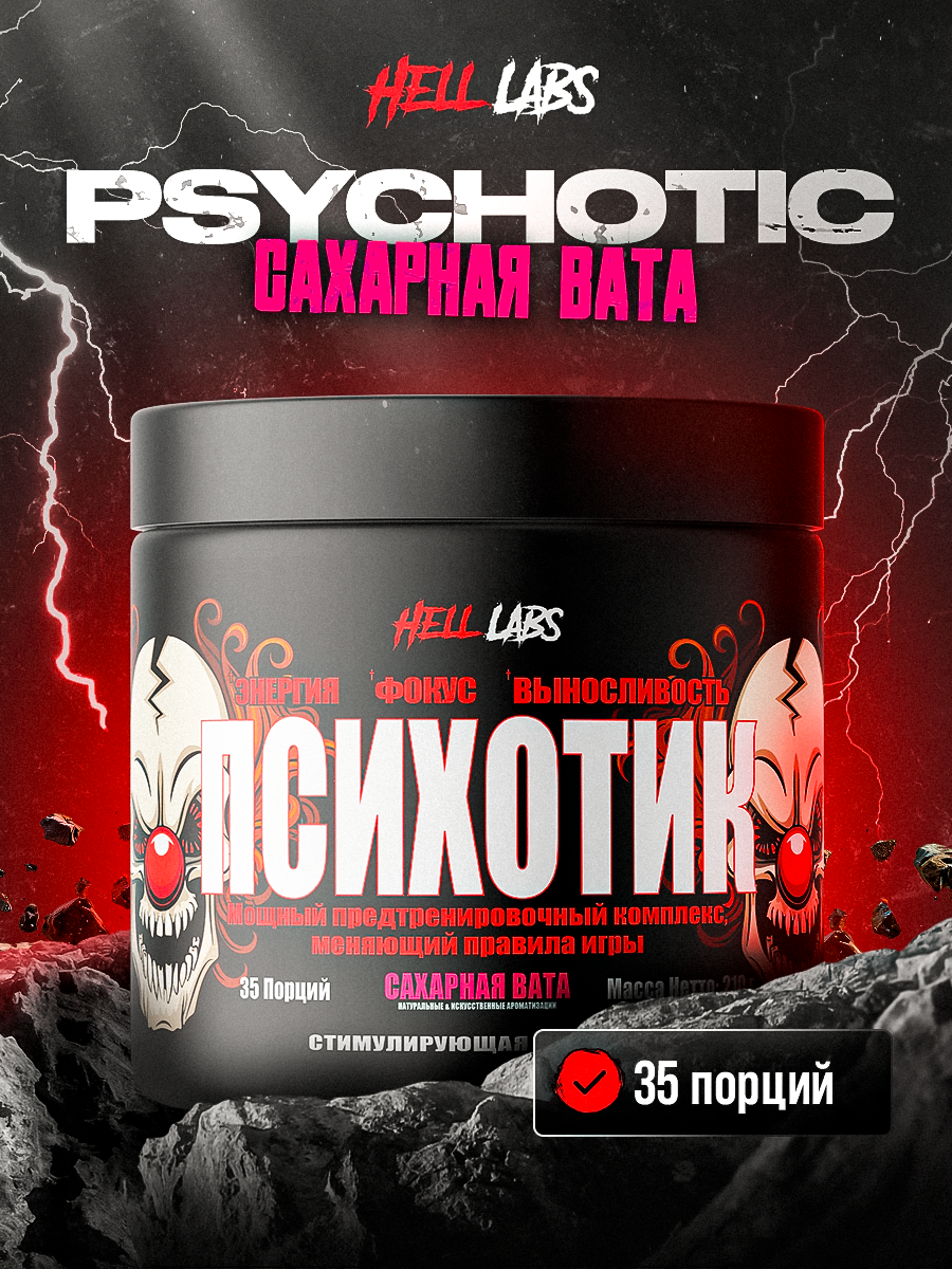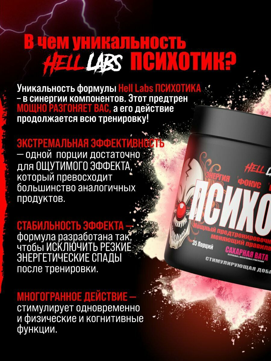 Предтренировочный комплекс Hell Labs «Психотик», порошок, 210 г, 35 порций, сахарная вата: сравнение цен, характеристики, фото, актуальное наличие и цены.