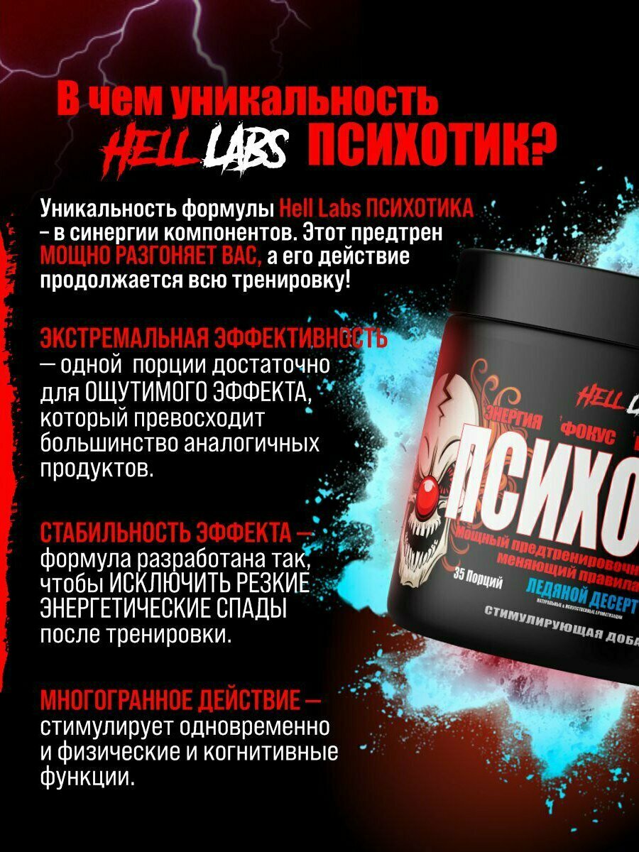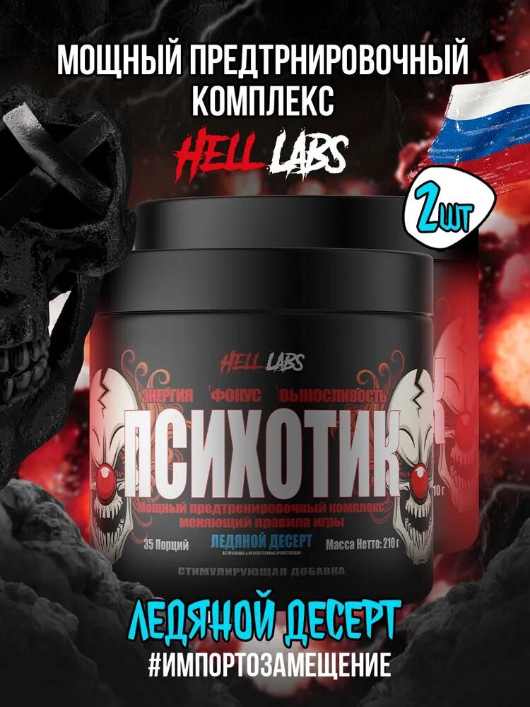 Купить (2 Банки) Предтренировочный комплекс Hell Labs «Психотик», порошок, 210 г, 35 порций, ледяной десерт с доставкой по всей России.