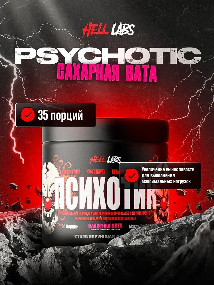 (2 Банки) Предтренировочный комплекс Hell Labs «Психотик», порошок, 210 г, 35 порций, сахарная вата: сравнение цен, характеристики, фото, актуальное наличие и цены.