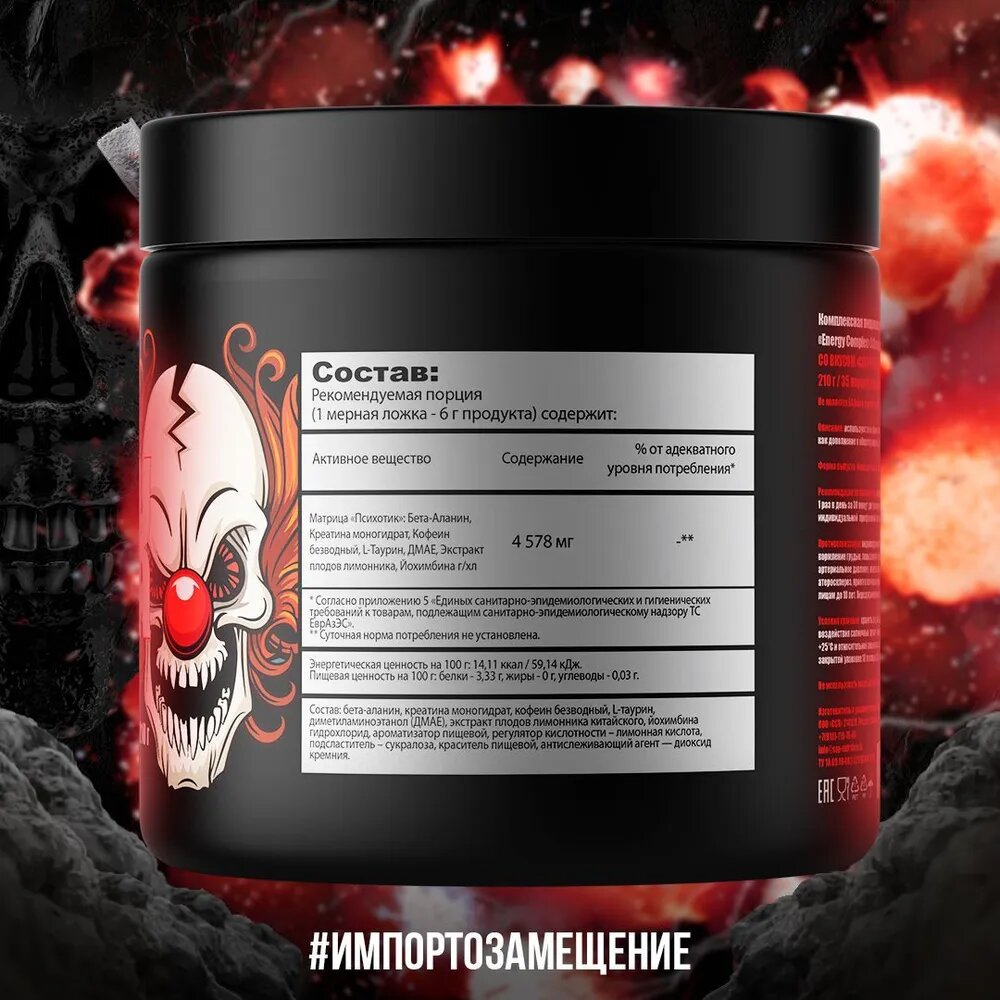 Hell Labs Psychotic 35serv включает матрицу из разных компонентов для энергии, драйва, выносливости и силы. Этот предтренировочный комплекс повышает работоспособность, снижает закисленность в мышцах и усиливает фокус внимания.