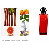 Ноты аромата Фруктово-цитрусовый аромат, Eau de rhubarbe ecarlate Cologne выражает свежесть хрустящего ревня и остроту лантаны, переплетенные с элегантными нотами мускуса.