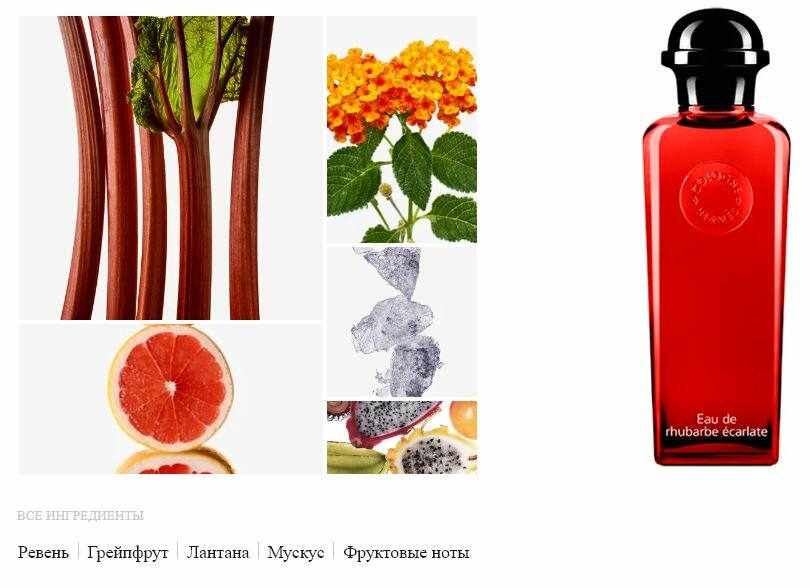 Перфумер Hermès, Christine Nagel, создала аромат Eau de rhubarbe ecarlate в 2016 году. Неожиданная интерпретация Hermès Cologne, он пересматривает удивительную свежесть травянистого растения: ревень.