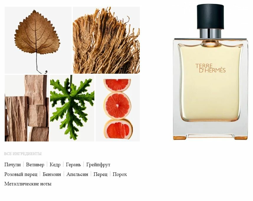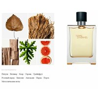 Туалетная вода Hermes Terre D'Hermes принадлежит к семейству цитрусовых, пряных и восточных ароматов. Она содержит такие компоненты, как алкоголь, парфюм, вода, лимонен, гидроксицитронеллаль, этилгексил метоксициннамат, цитронеллол, гексил циннамал, линалоол, этилгексил салицилат, бхт, бутил метоксидибензоилметан, экстракт дубового мха, гераниол, цитраль, фарнезол, бензоилбензоат.