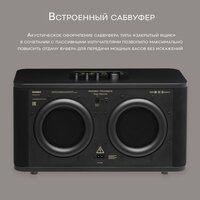 Акустическое оформление сабвуфера типа «закрытый ящик» в сочетании с пассивными излучателями позволило максимально повысить отдачу вуфера для передачи мощных басов без искажений. Уникальная форма акустической камеры позволяет оптимально настраивать басы, балансируя чувствительность и мощность, и создает расширенное звуковое поле, позволяющее ощутить всю мощь басовых нот, включая саббас и обеспечивает высокое звуковое давление начиная с 40 Гц. Эта по-настоящему большая блютуз колонка и «взрослый» звук не оставят равнодушным никого.