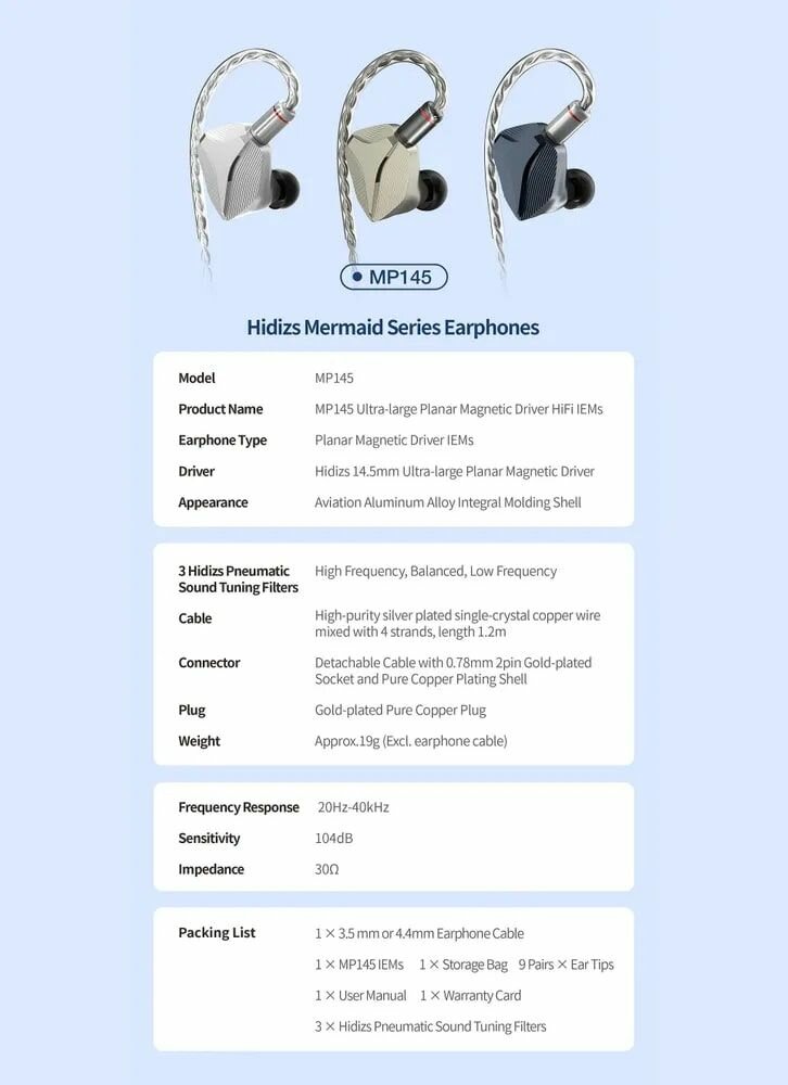 Hidizs MP145 — внутриканальные наушники с большими 14.5-миллиметровыми магнито-планарными драйверами, способными точно и детально передать каждую ноту ваших композиций. Наушники получили сертификацию Hi-Res Audio, что позволяет вам прослушивать аудиофайлы в высоком качестве. Дизайн корпуса наушников вдохновлён анатомией китов — таким образом Hidizs не только подчёркивают "большой" звук MP145, но и пытаются вместе с WDC (международной благотворительной организацией, занимающейся защитой китов и дельфинов) привлечь внимание к важности сохранения численности морских гигантов.
