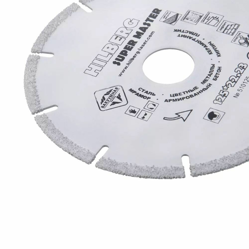 Диск алмазный отрезной Super Master (125х22.23 мм) Hilberg 510125 Назначение: сталь, цветные металлы, керамогранит, мрамор, армированный бетон, кирпич. Особенности: высококачественный алмазный диск, изготовленный с применением вакуумной пайки. Технология производства: вакуумная пайка.
