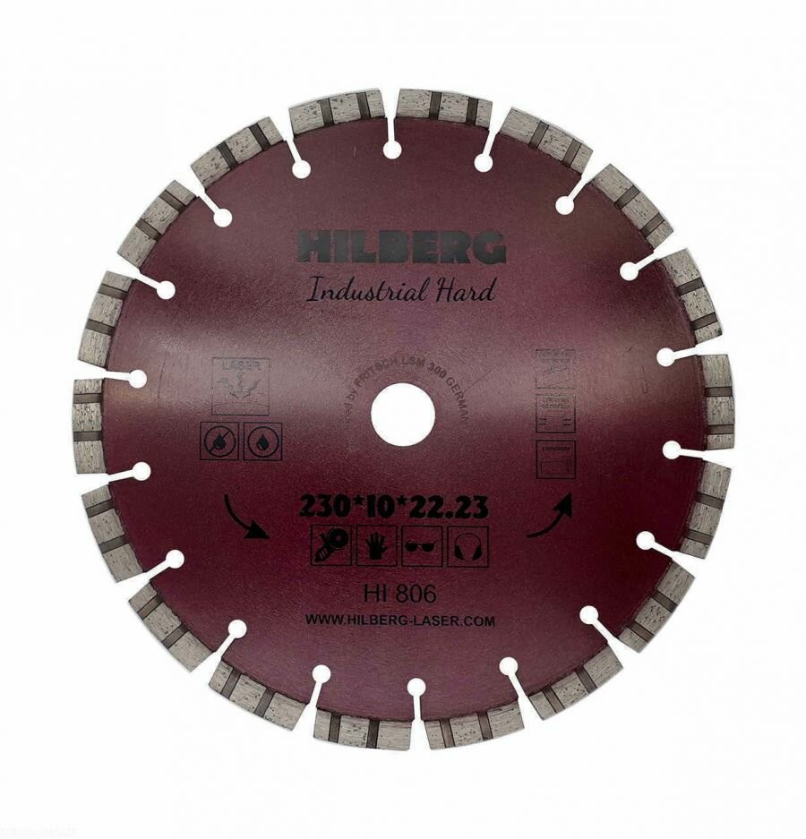Алмазный диск Hilberg Industrial Hard Laser 230 мм - с лазерной наваркой сегментов произведен на немецком оборудовании Dr. Fritsch. Диск используется для резки сильно армированного бетона, армированного бетона, слабо армированного бетона, твердого бетона. Толщина алмазного слоя 3,2 мм, а высота 10 мм. Посадочное отверстие - 22,23 мм. Диск обладает повышенной скоростью реза. Подходит для работы на УШМ.