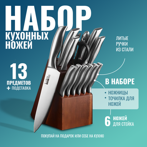 Состав набора: Столовый нож – 6 шт, шеф-нож – 1 шт, нож для хлеба - 1 шт, кухонные ножницы – 1 шт, точилка для ножей – 1 шт, универсальный нож – 1 шт, нож для нарезки – 1 шт, нож для резки овощей – 1 шт, деревянная подставка – 1 шт.