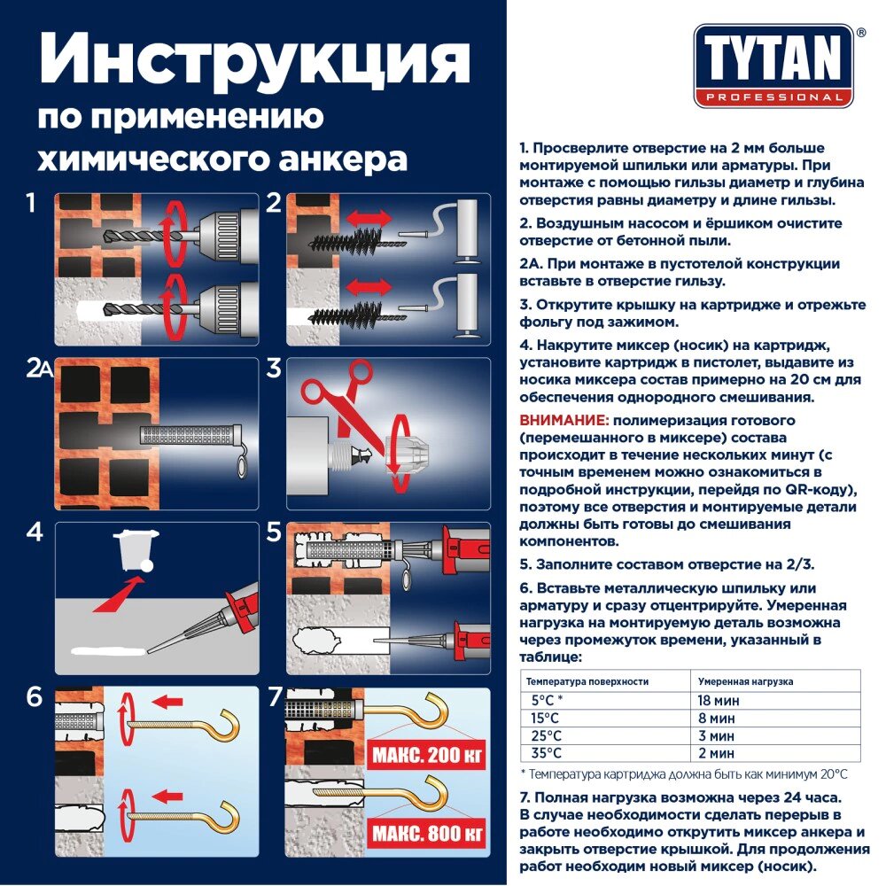 Химический анкер TYTAN PROFESSIONAL универсальный 300 мл - это продукт, который служит для фиксации крепежа в твердые основания, такие как: бетон, натуральный и искусственный камень, пустотелый кирпич, газобетон.