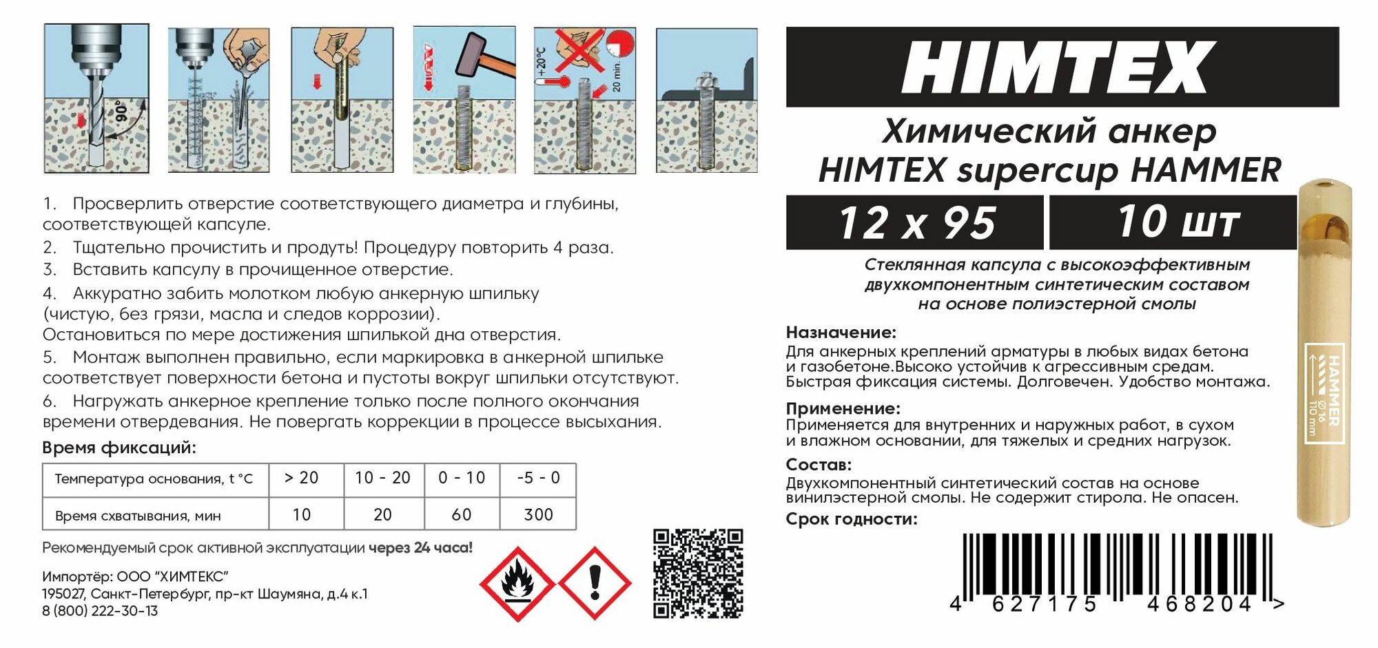 HIMTEX SUPERCAP - стеклянная капсула с высокоэффективным двухкомпонентным синтетическим составом на основе винилэстерной смолы. Специально разработана для осуществления анкерных креплений в тяжелом бетоне, железобетоне и природном камне. Капсула с синтетической смолой и кварцевой крошкой содержит в себе стеклянную ампулу с катализатором, которые при технологическом разрушении анкер-шпилькой во время установки перемешиваются и вступают в химическую реакцию. Кварцевая крошка совместно с осколками стекла оболочки капсулы обеспечивают дополнительное армирование соединения (в отличие от мягких упаковок). Рекомендуются для использования в любых отверстиях, в том числе выполненных с применением алмазной техники, в водонасыщенном бетоне и даже под водой. Не сложная в монтаже технология, быстрое отверждение, сочетает высочайшую прочность, химическую и термическую стойкость узлов анкерного крепления. Экономичность и удобство применения обуславливаются точным расчетом расхода капсул (1 капсула – 1 элемент крепления). Насадки для установки специальных анкер-шпилек подходят для стандартного трехкулачкового патрона дрели, шуруповерта или перфоратора. Преимущества химического анкера:
