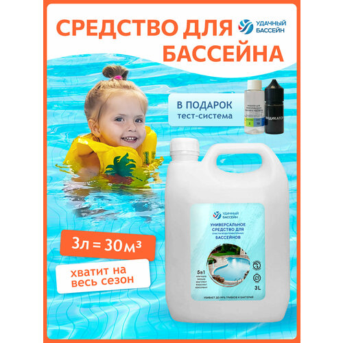 Химия для бассейна. Средство для очистки и дезинфекции воды УДачный бассейн 5в1 разработан для получения кристально чистой воды. Универсальное дезинфицирующее средство представляет собой комплексный уход за бассейном и не требует замены воды. Концентрат безопасен для детей и взрослых. При использовании не имеет цвета и запаха: не вызывает аллергии, не щиплет глаза, не сушит кожу, без раздражения слизистых и кожных покровов. Заменяет перекись 6, 10 и 37 процентов, без хлора. Средство для очистки флокулянт. альгицид борется с возникновением и размножением водорослей, зелени и обрастаний, работает против цветения и помутнения, для полного осветления. Не пенящийся препарат эффективно выполняет комплексную дезинфекцию - антимикробную обработку уничтожение в отношении опасных бактерий, в том числе цианобактерий, плесени, грибков и вирусов, очистку взвесей металлов (ржавчины, железа и пр.) и механических примесей. Жидкий раствор вызывает и ускоряет свертывание вредных частиц, примесей, взвесей, мусора листвы в хлопья. Дезинфектор отделяет грязь, поэтому сначала водичка мутнеет. Для легкого удаления извести со дна желательно иметь всё для бассейна, используйте следующий набор: песочный или обычный фильтр насос и водный пылесос (не вызывает коррозии оборудования), сачок. Купаться можно сразу, как вода станет чистой. Важно: Если фильтр отсутствует и осадок не убран пылесосом, при купании вода снова перемещается с грязным осадком. Чистящее средство обеззараживает не только наполненной чаши, но и стен от налета слизи. Добавляйте хозяйственный товар реагент УДачный бассейн 5в1 в нужном количестве, в зависимости от водяного объема, в детский надувной, каркасный большой глубокий, детский, любой плавательный бассейн для плавания в чистой водичке. Дзсредство жидкий концентрат консервант для бассейна в канистре 3 литра подходит для ухода за емкостями и поверхностями в спортивных центрах, аквапарках, банях. Не меняет Ph. Безопасно для почвы. Также в ассортименте канистры 1л и 5литров.