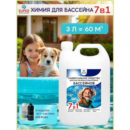 Химия для бассейна. Средство для очистки и дезинфекции воды в бассейне. Супер «Удачный бассейн» 7в1 разработан для получения кристально чистой воды. Универсальное дезинфицирующее средство представляет собой комплексный уход за бассейном и не требует замены воды. Концентрат безопасен при использовании для людей и животных не имеет цвета и запаха: не вызывает аллергии, не щиплет глаза, не сушит кожу, без раздражения слизистых и кожных покровов. Заменяет перекись 6, 10, 37 процентов. Средство для очистки воды борется с возникновением и размножением водорослей, зелени и обрастаний, работает против цветения и помутнения, для полного осветления. Не пенящийся препарат эффективно выполняет комплексную дезинфекцию - антимикробную обработку уничтожение в отношении опасных бактерий, в том числе цианобактерий, плесени, грибков и вирусов, очистку взвесей металлов (ржавчины, железа и пр.) и механических примесей. Жидкий раствор вызывает и ускоряет свертывание вредных частиц, примесей, взвесей, мусора листвы в хлопья. Дезинфектор отделяет грязь, поэтому сначала водичка мутнеет. Для легкого удаления извести со дна и поверхности желательно иметь всё для бассейна, используйте следующий набор: песочный или обычный фильтр насос и водный пылесос (не вызывает коррозии оборудования), сачок. Важно: Если фильтр отсутствует и осадок не убран, при купании вода снова перемещается с грязным осадком. Купаться можно сразу, как вода станет чистой. Чистящее средство обеззараживает не только воду наполненной чаши, но и стены от налета слизи. Добавляйте хозяйственный товар реагент супер «Удачный бассейн» 7в1 в нужном количестве, в зависимости от водяного объема, в детский надувной, каркасный большой глубокий, любой плавательный бассейн для плавания в чистой водичке. Дзсредство жидкий концентрат для бассейна в канистре 3 литра подходит для ухода за емкостями и поверхностями в спортивных центрах, аквапарках, банях, джакузи. Не меняет Ph. Безопасно для почвы.