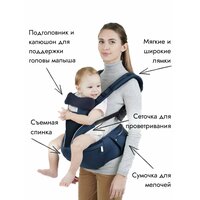 - эргономичного сиденья, которое крепится к талии взрослого широким поясом на липучке и дополнительно фиксируется фастексом