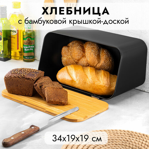 Хлебница "Черная" 34х19х17 см с бамбуковой крышкой-доской 34х18х1 см, металл/бамбук