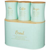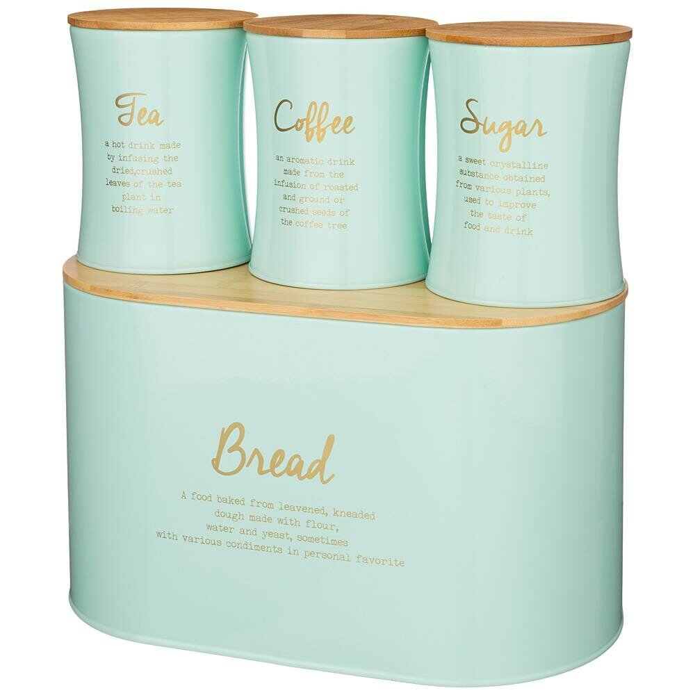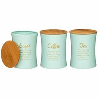 В комплект также входят три банки для сыпучих продуктов объемом 1 литр каждая. Они изготовлены из металла и имеют зеленый цвет, что придает им современный и стильный вид.