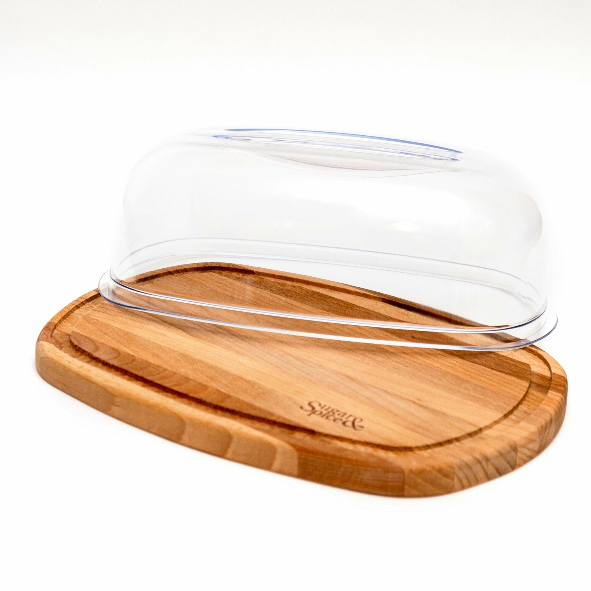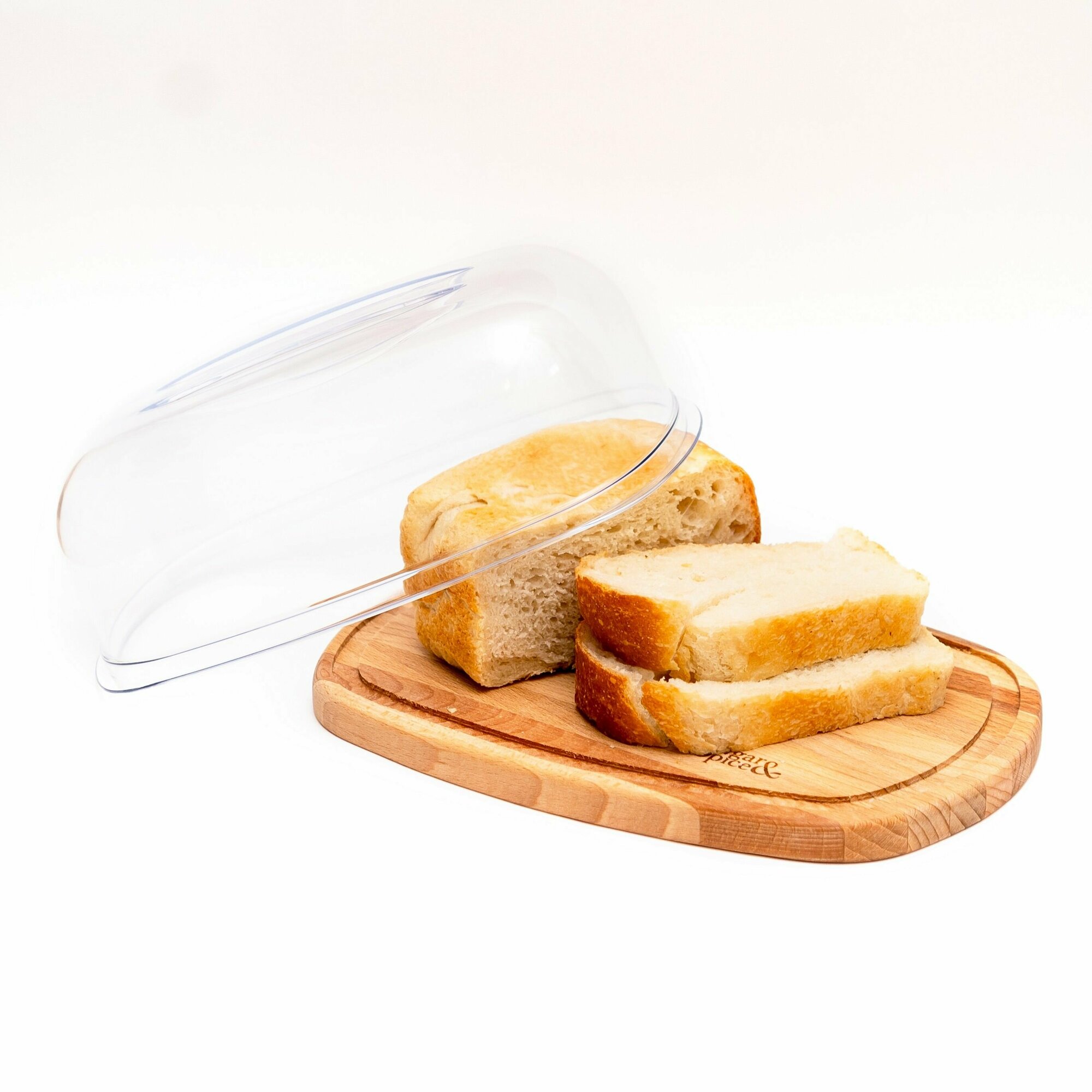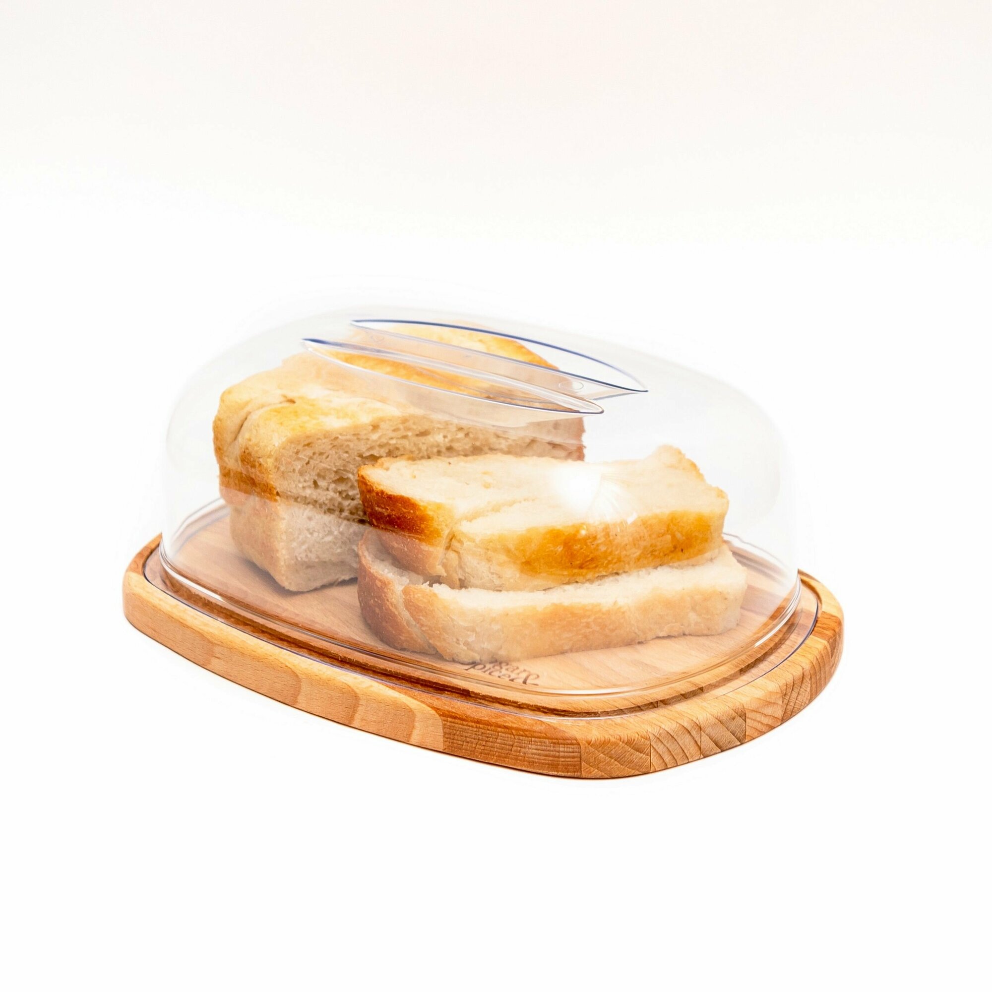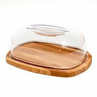 Деревянная хлебница с прозрачным колпаком.