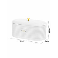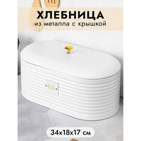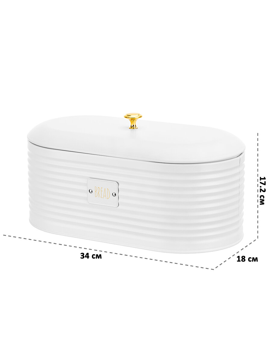 Хлебница с крышкой "Белая" размером 34х18х17,2 см выполнена из металла и поможет сохранить хлеб и булочки вкусными и свежими. Металлическая хлебница имеет стильный дизайн и украшена надписью "Bread" ("Хлеб"). Аккуратная ручка золотистого цвета на крышке придаёт изделию нарядный вид. Металлическая хлебница не впитывает запахи, держит температуру, предотвращает попадание влаги, а значит – защитит продукты от плесени. Настольная хлебница надежно закрывается металлической крышкой. Ёмкость можно приспособить не только под хлеб, но и для хранения пакетов с крекерами, печеньем, сухарями. Не рекомендуется применять абразивные моющие средства. Не подходит для использования в посудомоечной машине и микроволновой печи. Поставляется в картонной коробке. Металлическая хлебница подойдёт в подарок любой хозяйке. Такая посуда станет настоящим украшением вашей кухни и поможет создать в доме порядок и уют!