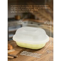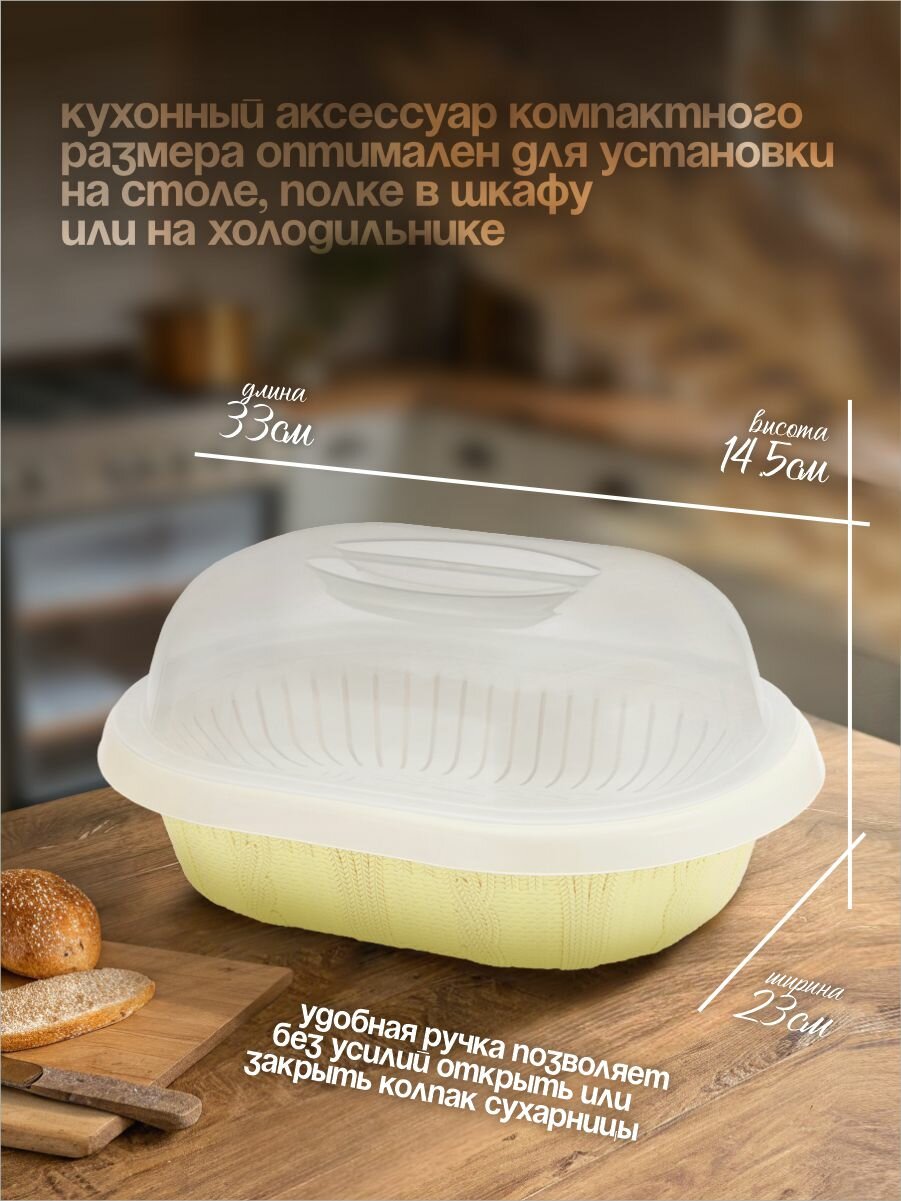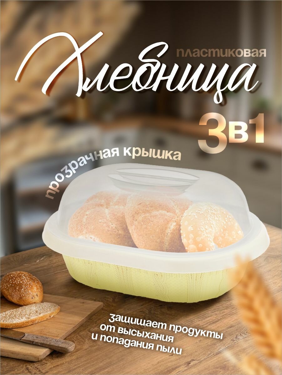 Мягкий ароматный хлеб - пожалуй, одно из самых вкусных блюд в мире. И как же хочется продлить эту свежесть и неповторимый вкус надолго! Современная хлебница Плетёнка удивит Вас своим функционалом: 3 в 1 - хлебница, салатница, дуршлаг. Хлебница настольная от бренда elfplast - это практичный пластиковый контейнер используется для хранения хлебобулочных изделий, таких как хлеб или сладости. Выпечка, хранящаяся в таких емкостях, на долго сохраняет мягкость и аромат свеже испеченного хлеба. Эргономичная, универсальная и компактная - она предотвратит преждевременное высыхание и порчу хлебобулочных изделий. Храните в ней хлеб, смешивайте салаты или используйте как дуршлаг - она станет незаменимой вещью на кухне и уже после первого использования вы не захотите с ней расставаться. Настольная хлебница для хлеба изготовлена из пищевого пластика, безопасного материала. Через прозрачный корпус крышки хорошо просматривается содержимое, а удобная ручка позволяет без усилий открыть или закрыть колпак сухарницы. Откидная крышка булочницы плотно прилегает к корпусу, не допуская попадания влаги и грязи. Корзинка для хлеба проста в использовании, удобна в хранении, легко моется и может храниться в холодильнике. Настольная хлебница дольше сохраняет хлеб и булочки свежими, экономит место и является отличным, стильным и функциональным аксессуаром для дома. Булочница для кухни неприхотлива в уходе, легко отчищается, эргономичная и вместительная - её высота 14,5см, глубина 23 см, длинна 33см, позволяет хранить одновременно несколько единиц продукции. Кухонный инвентарь в виде хлебницы с крышкой порадует женщин и мужчин, бабушек, дедушек и детей. Произведено в России.