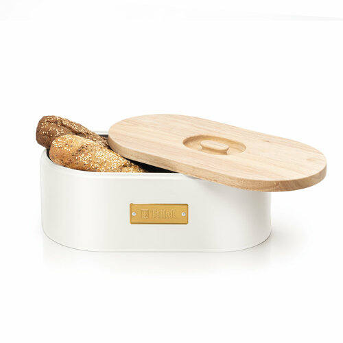 Размеры: 33,5 х 18,5 х 12,5 см. Корпус хлебницы выполнен из углеродистой стали. Цвет внутри и снаружи - молочный. Внутри хлебницы нет стыков во избежание скапливания крошек хлеба. Крышка выполнена из гевеи. Толщина крышки - 1,5 см. Эргономичная конструкция ручки с плавными изгибами обеспечивает удобный хват при отсутствии острых углов. Особая конструкция крышки позволяет перевернуть ее и использовать как разделочную доску для хлеба. На внутренней стороне крышки присутствуют желобки для сбора крошек хлеба. Прочная конструкция гарантирует долговечное использование.